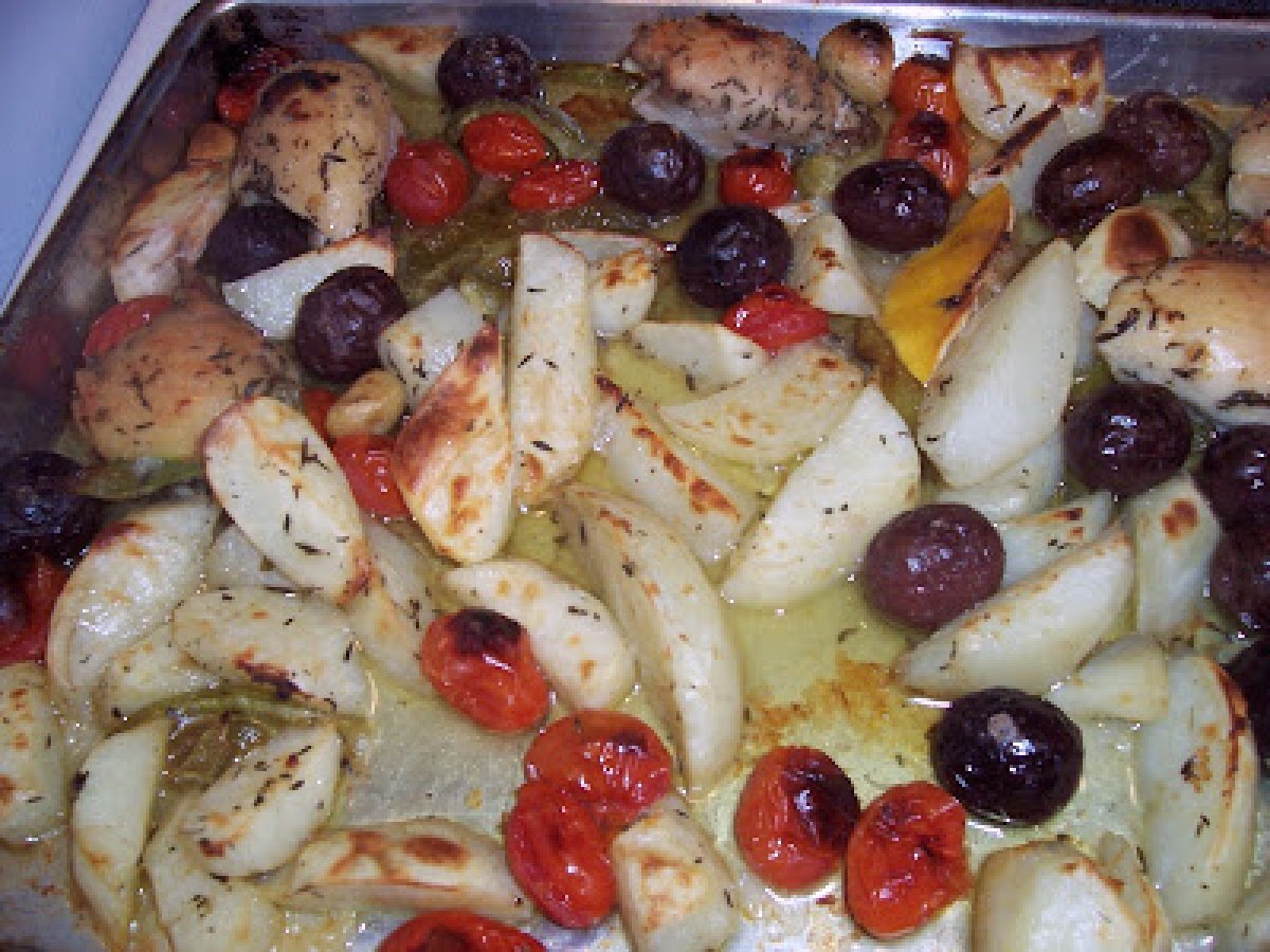 Poulet au four (one pan chiken bake) votez maintenant Platfacile50 min Envoyer cette recette à un ami Imprimer cette page Poser une question à l'auteur Publier votre photo de cette recette Ingrédients 3 500 g poulet (hauts de cuisses) 8 pommes de terre 1 citron coupe en quartiers 8 gousses d`ail 1 poivron 3 cuillères à soupe d`huile d`olive Quelques branches de thym ( vous pouvez utiliser le them en poudre) 50 g d`olives noires 250 g de tomates cerise