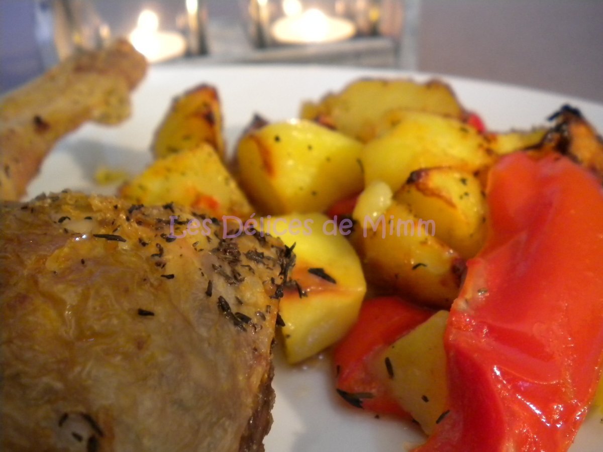 Poulet aux poivrons et pommes de terre PrécédentSuivant Platfacile1 h 10 m654 Kcal Envoyer cette recette à un ami Imprimer cette page Poser une question à l'auteur Publier votre photo de cette recette une recette sans chichis Ingrédients 4 4 cuisses de poulet 6-8 pommes de terre 3 poivrons 8 gousses d'ail 2 oignons 1 c à c de thym 2 c à s d'huile d'olive sel et poivre Coût estimé: 7.18Euros€ (1.79€/part)