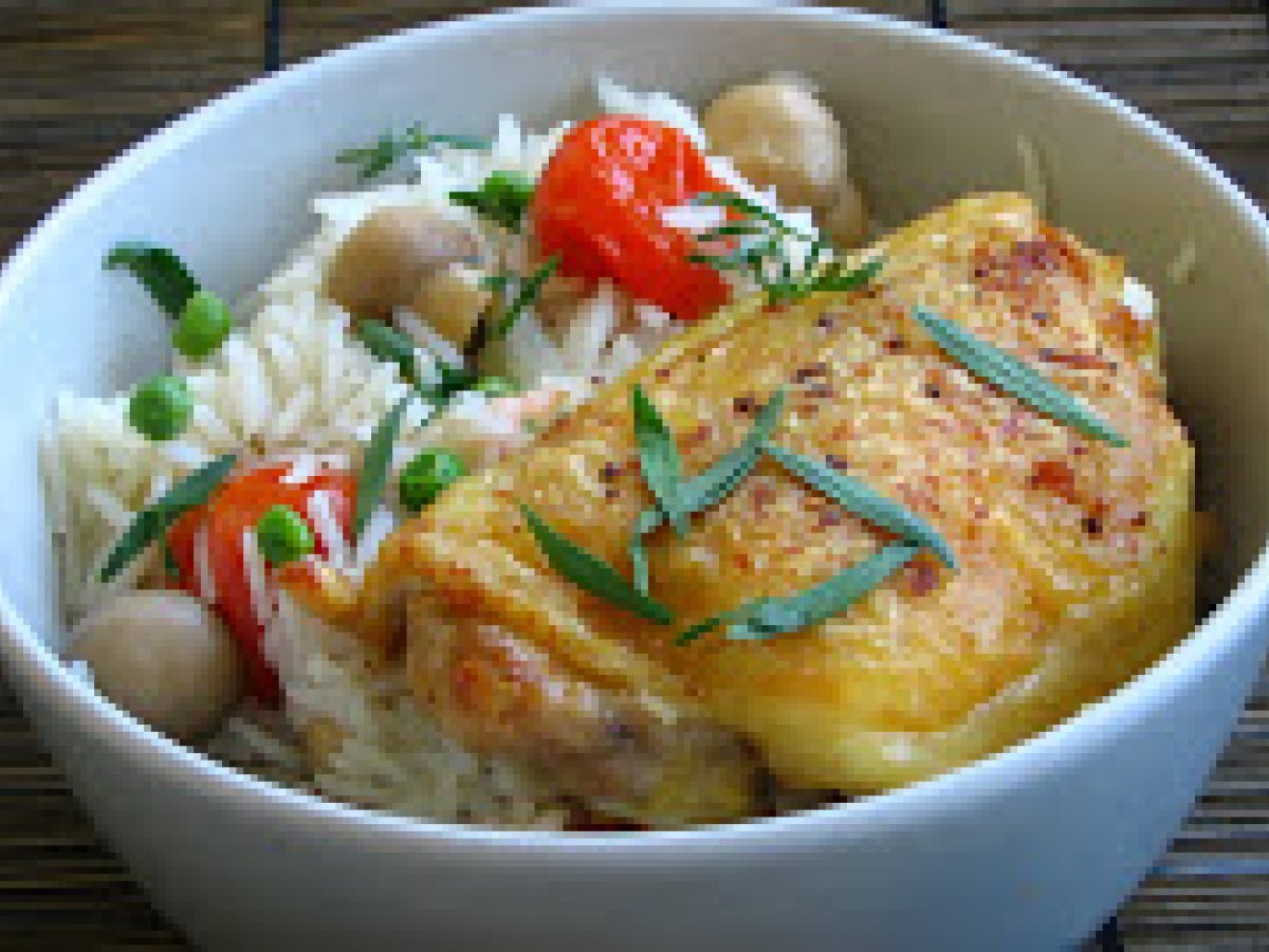 Poulet croustillant sel poivre à l'estragon et riz aux légumes