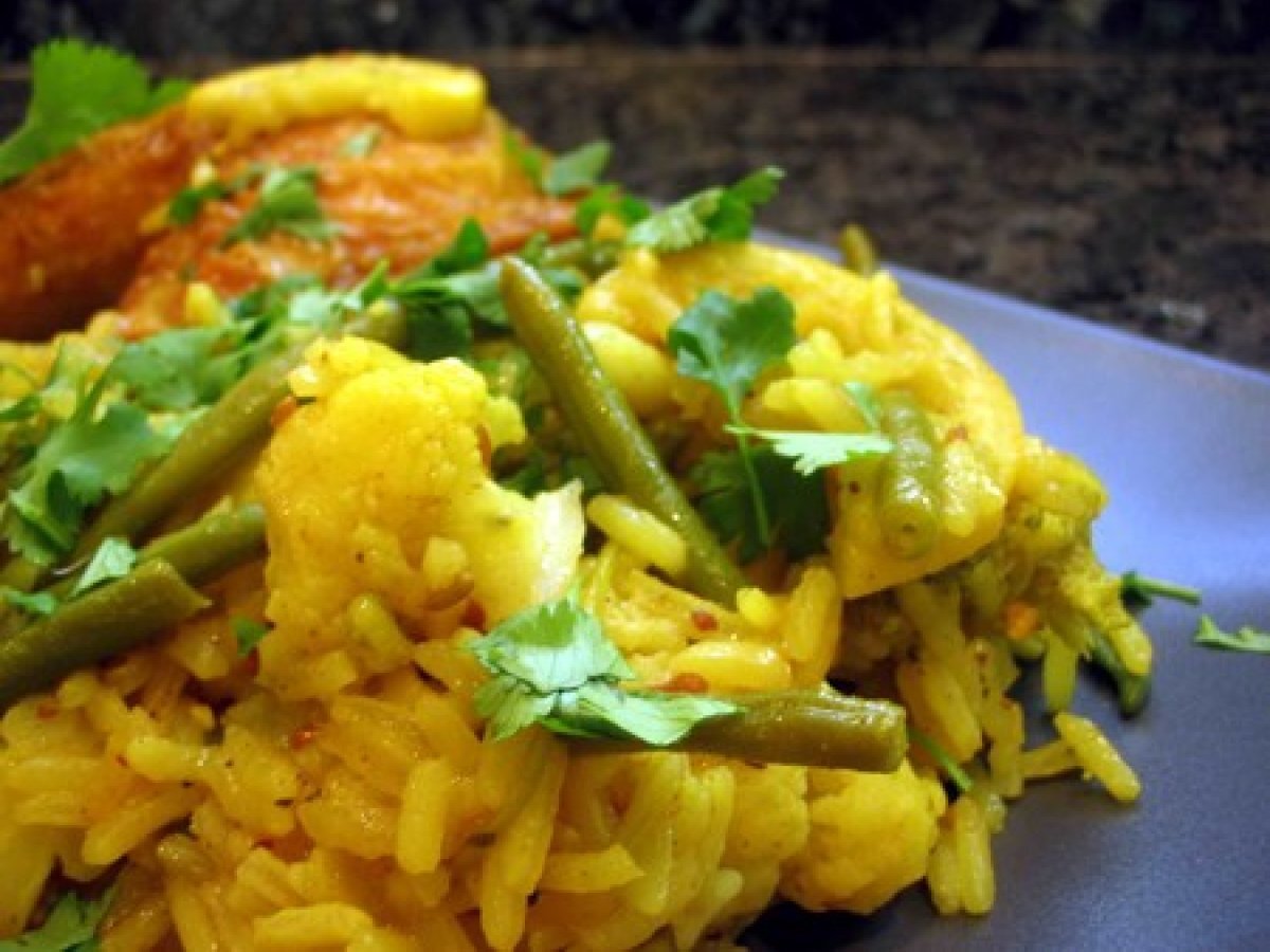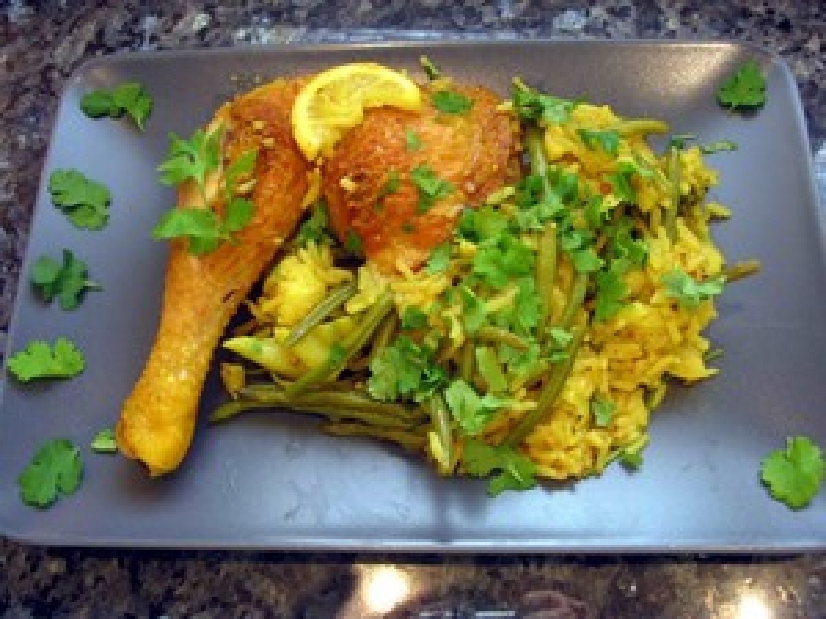 Poulet curry citron et pilaf de chou-fleur et haricots verts