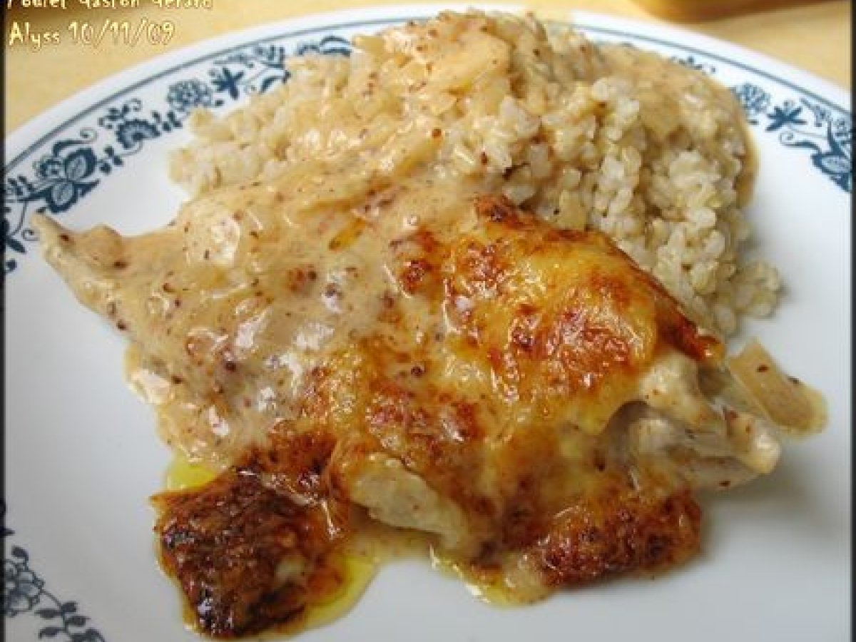 Poulet gaston-gérard (vin blanc, crème, moutarde, comté) PrécédentSuivant Platfacile50 min Envoyer cette recette à un ami Imprimer cette page Poser une question à l'auteur Publier votre photo de cette recette Une recette toute simple ,mais qui a tellement de goût! Ingrédients 6 1 poulet de 1 kg- 1 kg 500 (4 escalopes) une noix de beurre 100 g de comté 1 bonne cuillère à soupe de moutarde de Dijon (en grains) 1 cuillère à café de paprika 2 verres de vin blanc 50 cl de crème épaisse 3 oignons