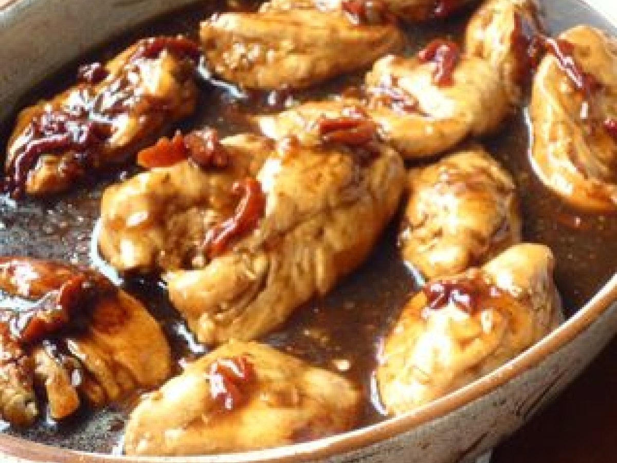 Poulet glacé au vinaigre balsamique et tomates séchées Platfacile40 min368 Kcal Envoyer cette recette à un ami Imprimer cette page Poser une question à l'auteur Publier votre photo de cette recette Ingrédients 4 2 échalotes émincées 2 gousses d'ail 4 blanc de poulet 350 ml de bouillon de poulet 15cl de vinaigre balsamique 10 tomates séchées finement émincées 4 cuillères à soupe de miel 3 cuillères à soupe de maïzena 1 cuillère à soupe d'huile d'olive Sel et poivre Coût estimé: 8.09Euros€ (2.02€/part)