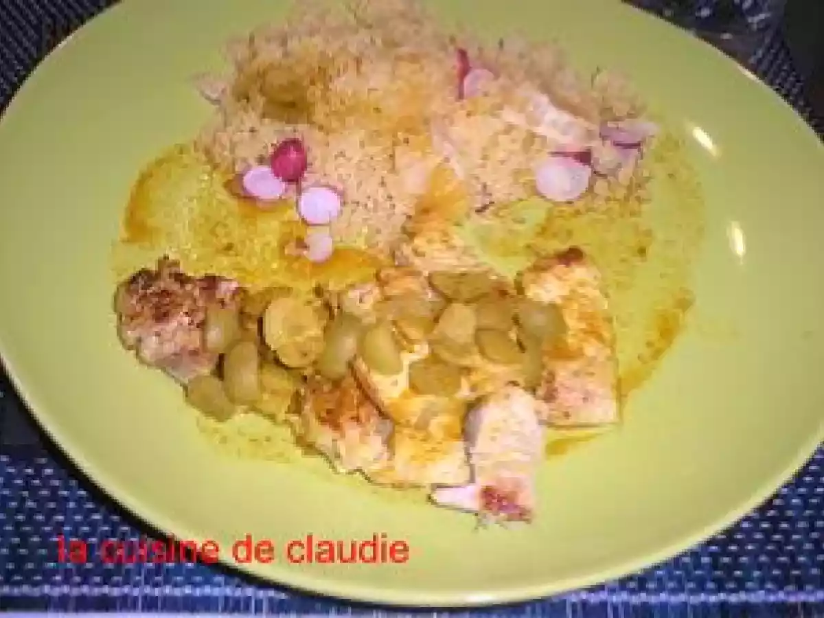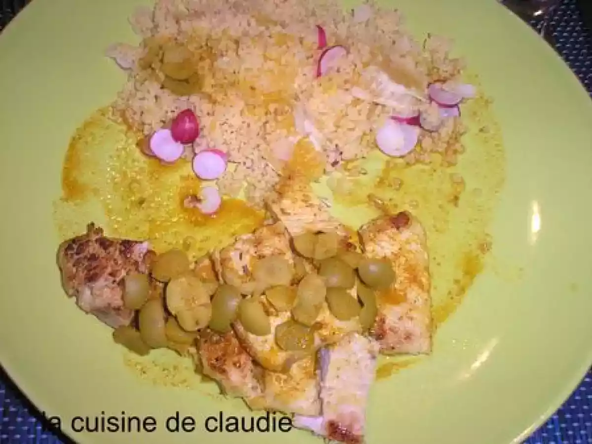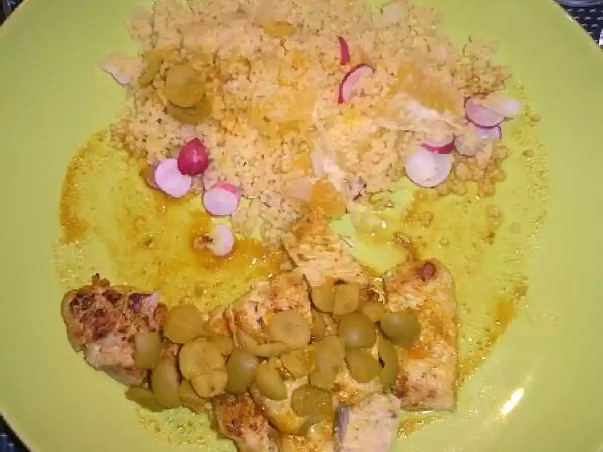 Poulet grillé aux olives avec couscous aux agrumes votez maintenant PrécédentSuivant Platfacile20 min Envoyer cette recette à un ami Imprimer cette page Poser une question à l'auteur Publier votre photo de cette recette Ingrédients 4 1 cuillère à café de gingembre 1 cuillère à soupe de curcuma 2 cuillères à café de coriandre 4 blancs de poulet 250 ml de bouillon de volaille 200 g d'olives vertes 1 grosse orange 250 ml d'eau 250 ml de jus d'orange 400 g de couscous 35 g d'amandes effilées 1 botte de radis roses