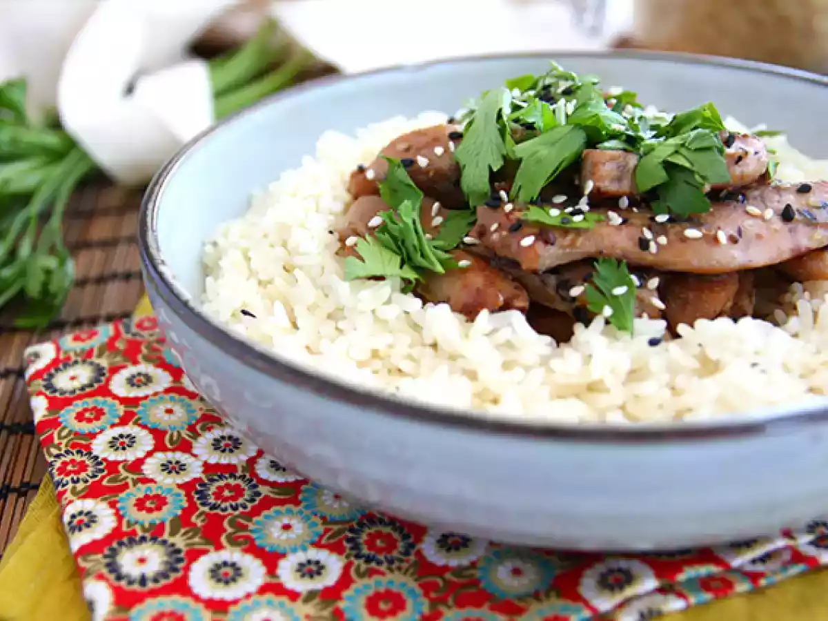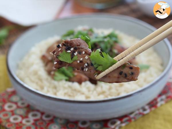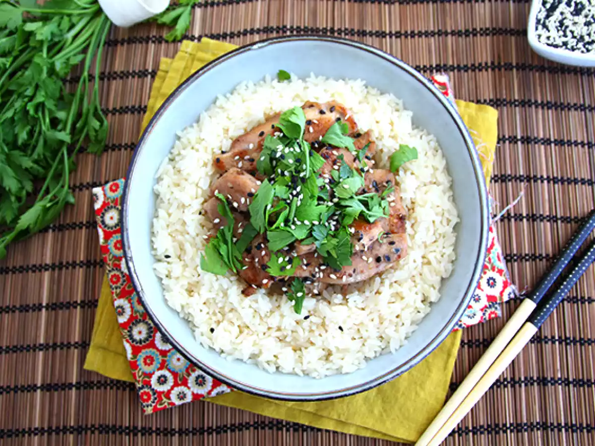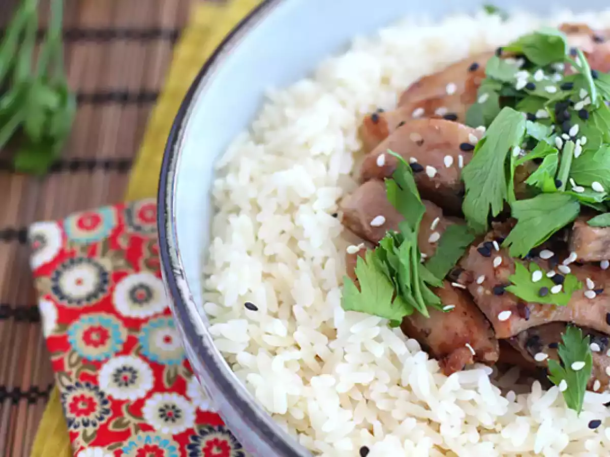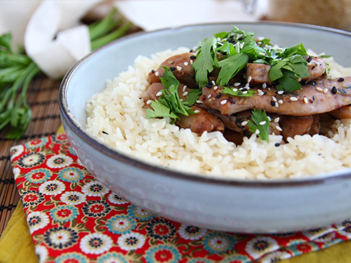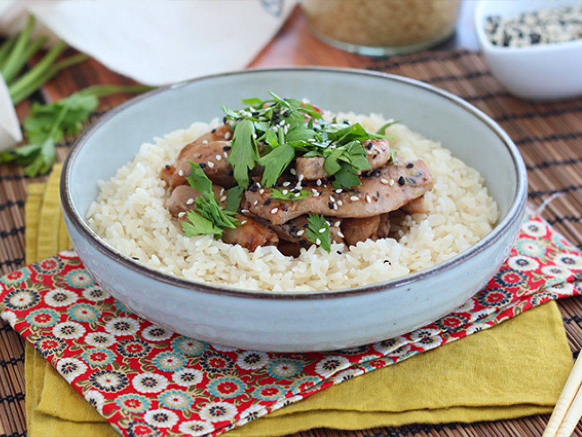 Une fois cuites, accompagner les lamelles de poulet de riz et saupoudrer le tout de coriandre fraîche / ciselée puis de graines de sésame.