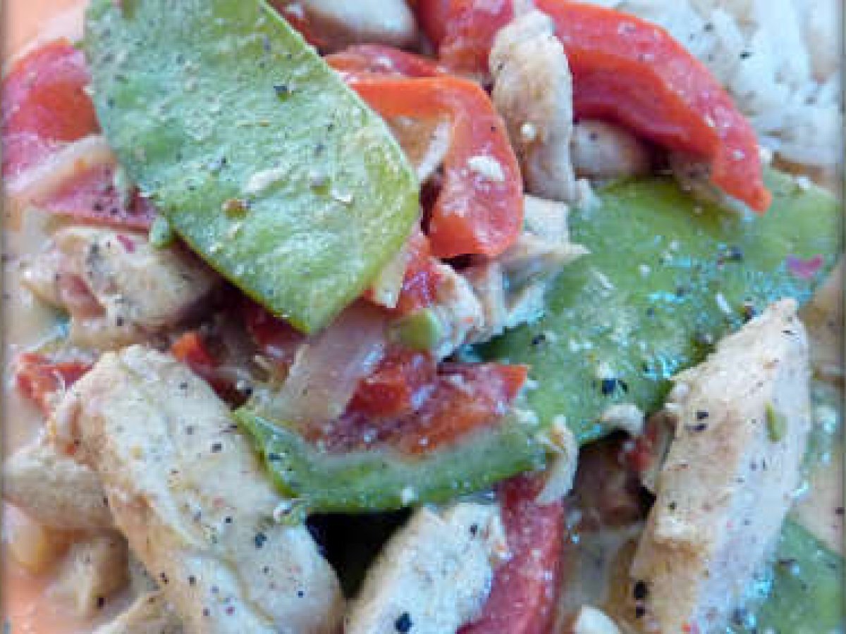 Poulet sauté au curry, poivron et pois gourmands Platfacile50 min Envoyer cette recette à un ami Imprimer cette page Poser une question à l'auteur Publier votre photo de cette recette Ingrédients 4 Pour 4 personnes 4 blancs de poulet 250 g de pois gourmands 2 oignons 1 poivron rouge 1 cuillère à soupe de sauce soja 1 brique de lait de coco (20cl) 1 bonne cuillère à café de pâte de curry doux 1 cuillère à café de gingembre le jus d1/2 citron 1 petit verre deau bouillante