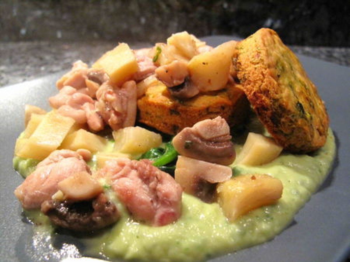 Poulet sauté aux artichauts sur coulis d'artichauts à l'ail des ours votez maintenant Platfacile1 h 10 m Envoyer cette recette à un ami Imprimer cette page Poser une question à l'auteur Publier votre photo de cette recette Ingrédients 4 Pour le coulis d'artichauts à l'ail des ours : un peu de matière grasse 8 fonds d'artichauts surgelés environ 1/2 litre de bouillon de volaille sel, poivre 75 g de beurre pommade les 3/4 d'un gros bouquet d'ail des ours Pour les épinards : 1 kilo d'épinards frais non préparés, préparés 2 grosses gousses d'ail, pelées, coupées en 2 et dégermées un peu de matière grasse sel, poivre Sauté de poulet aux artichauts : 4 cuisses de poulet sans peau sans os et coupées en morceaux de la taille d'une bouchée 4 fonds d'artichauts surgelés 1 poignée de champignons de Paris 4 échalotes pelées et ciselées 1 gousse d'ail, pelée et hachée 1 verre de vin blanc un peu de matière grasse sel, poivre un filet d'huile de noisette pour servir