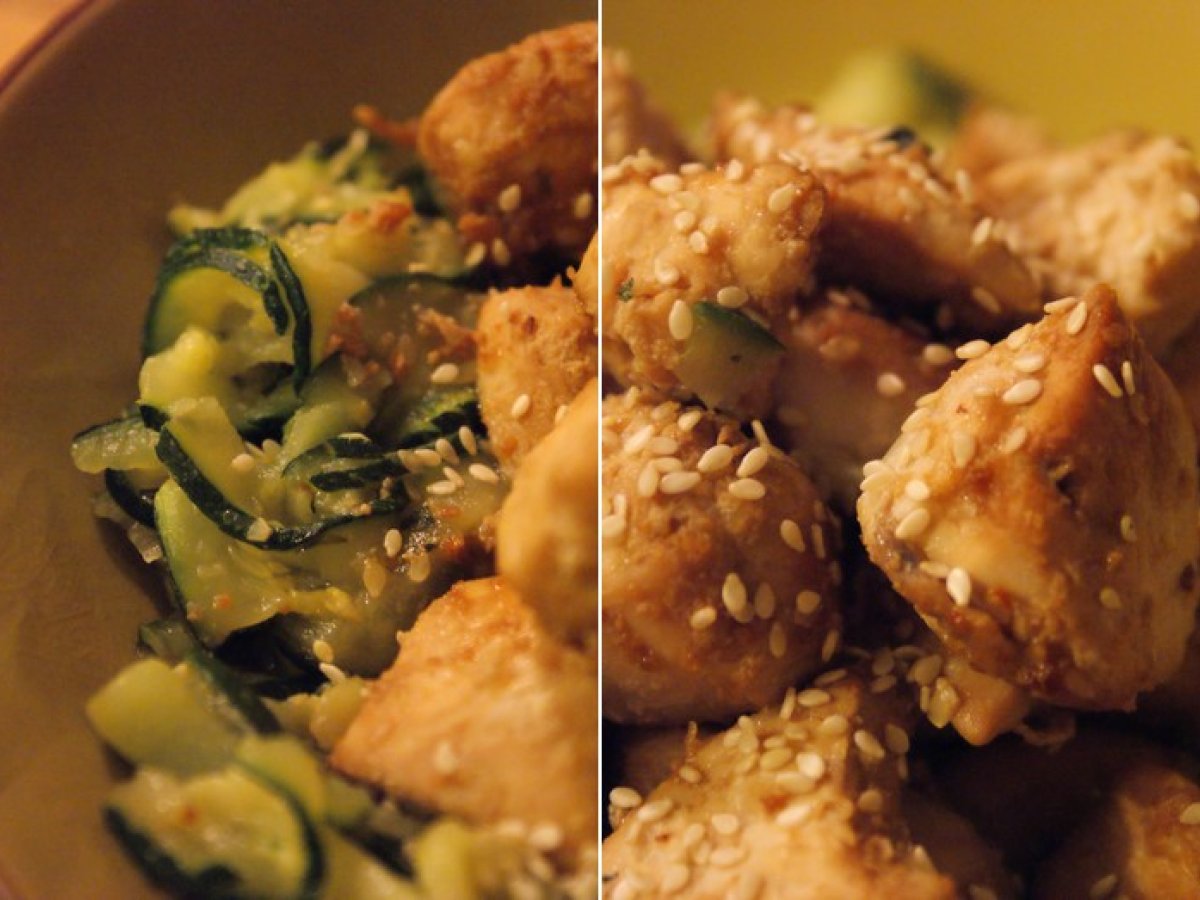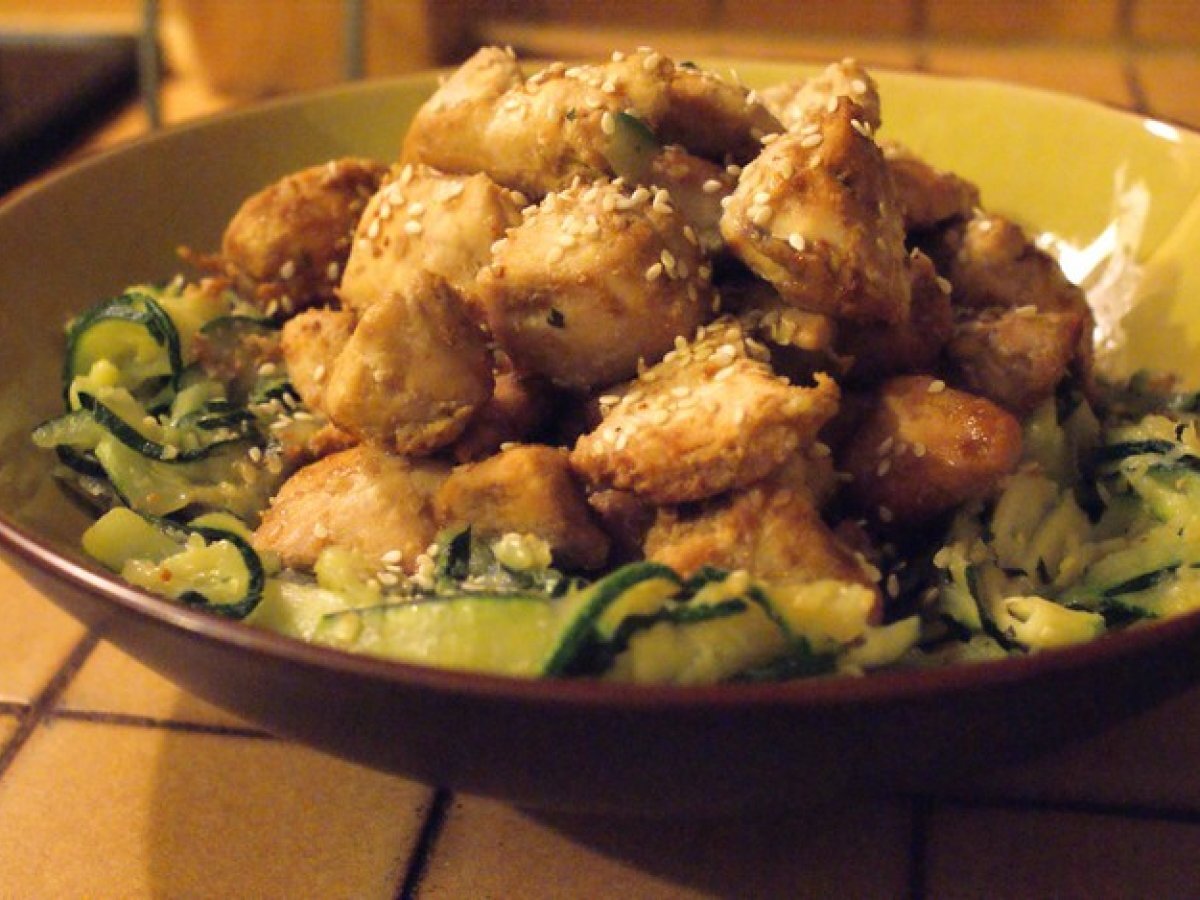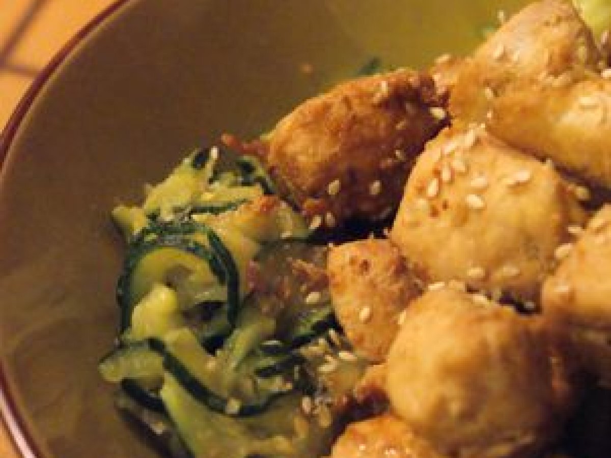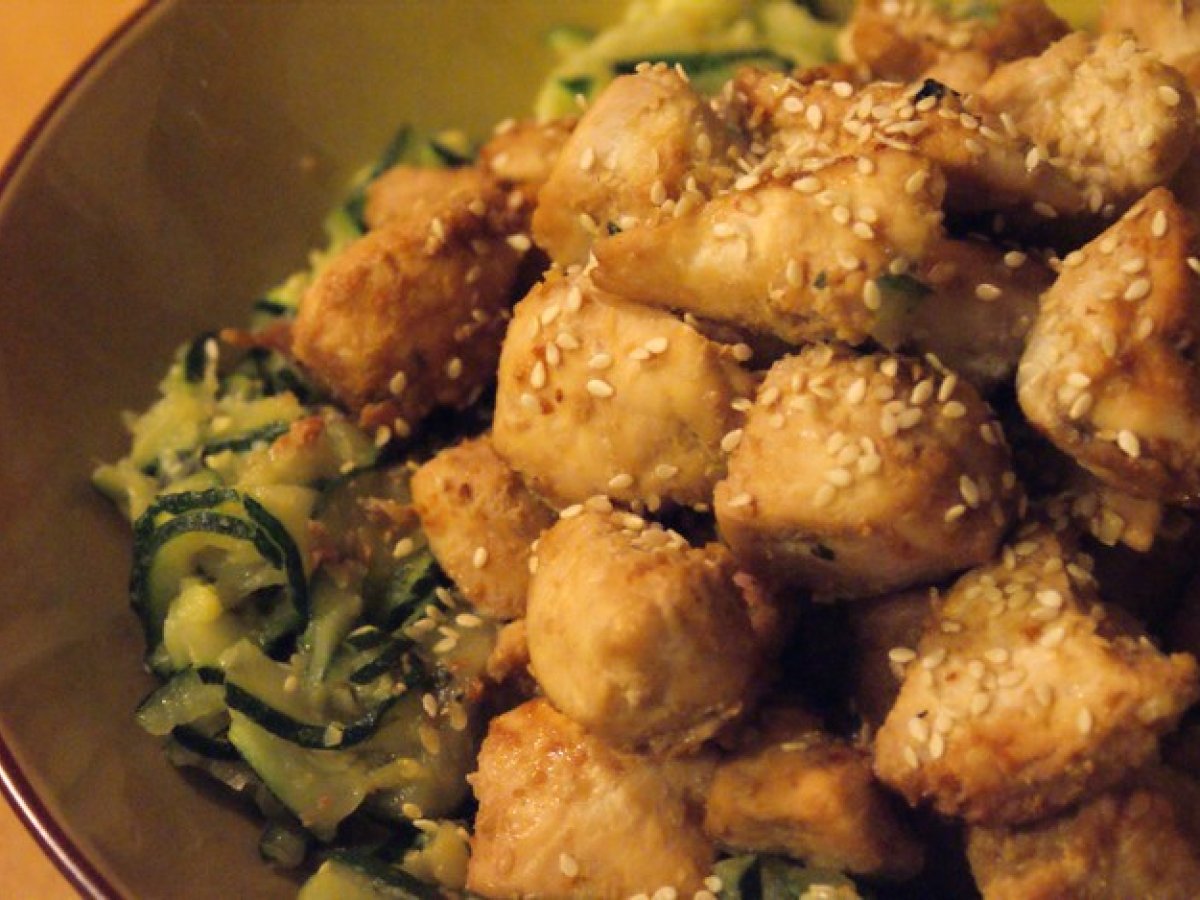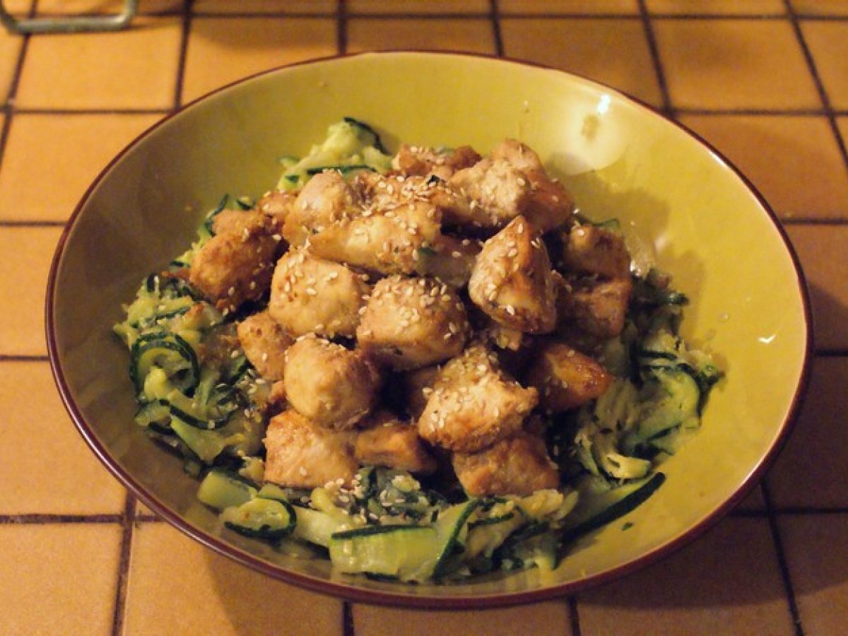 Poulet teriyaki et tagliatelles de courgette votez maintenant PrécédentSuivant Platfacile30 min245 Kcal Envoyer cette recette à un ami Imprimer cette page Poser une question à l'auteur Publier votre photo de cette recette Ingrédients 4 6 escalopes de poulet 6 cuillères à café de sauce teriyaki 2 cuillères à café de sauce soja 4 cuillères à café d'ail semoule 4 cuillères à café de graines de sésame 2 courgettes 2 cuillères à café de menthe ciselée