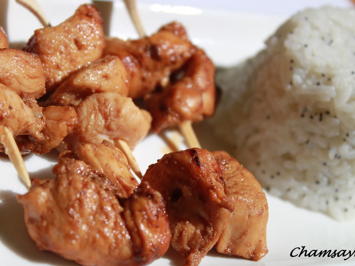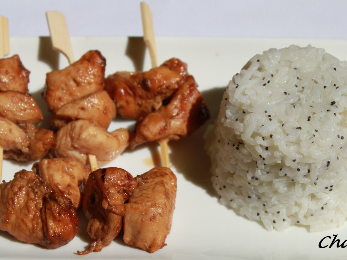 Poulet yakitori et son riz aux graines de pavot PrécédentSuivant Platmoyen30 min201 Kcal Envoyer cette recette à un ami Imprimer cette page Poser une question à l'auteur Publier votre photo de cette recette Ingrédients 4 Pour vos brochettes : 500 g de blanc de poulet ou escalope de poulet 2 cas de gingembre frais coupé en petits dés ou râpé 2 cas de miel 3 cas de sauce soja 1 cas de vinaigre de riz Coût estimé: 6.83Euros€ (1.71€/part)