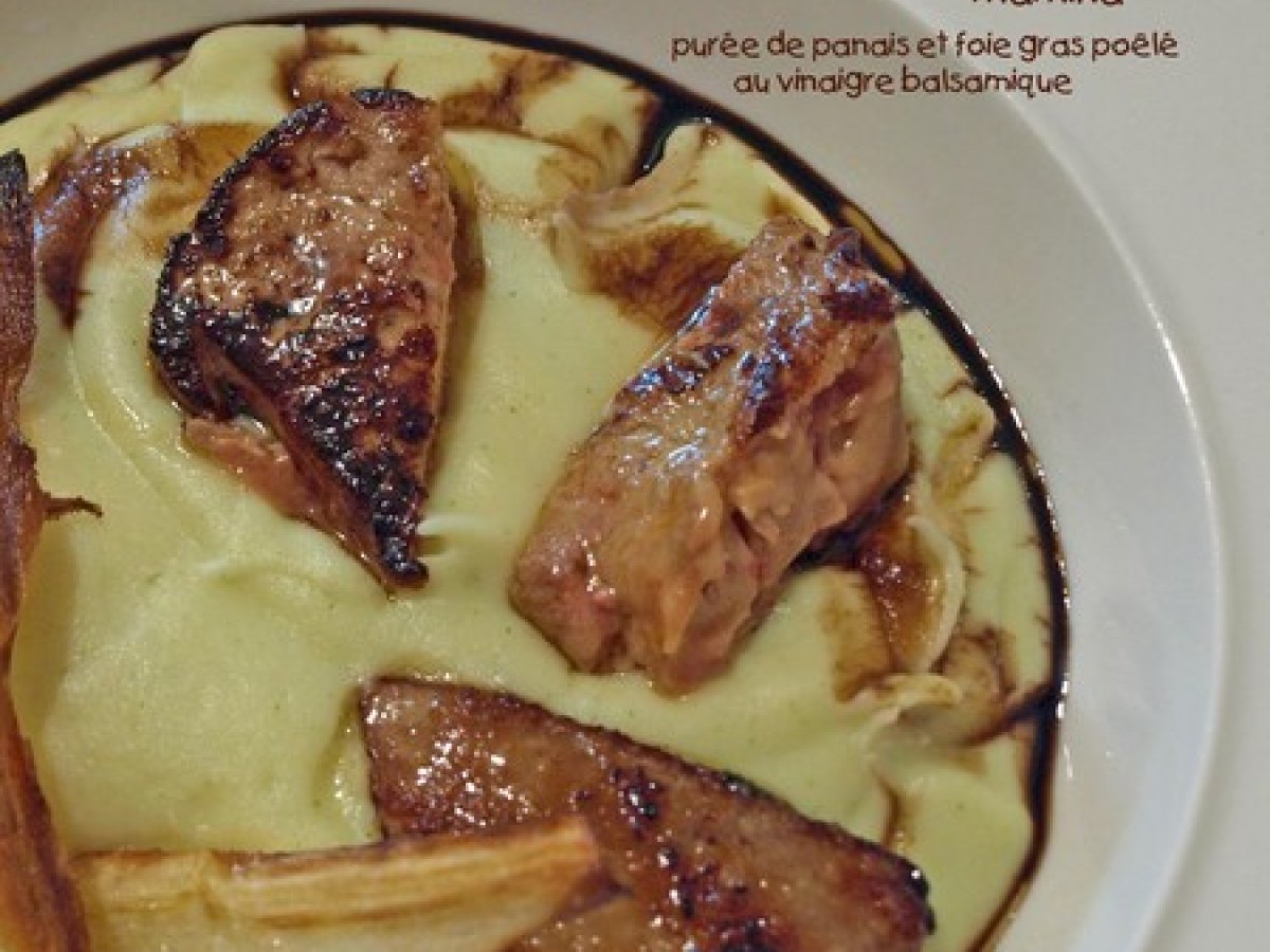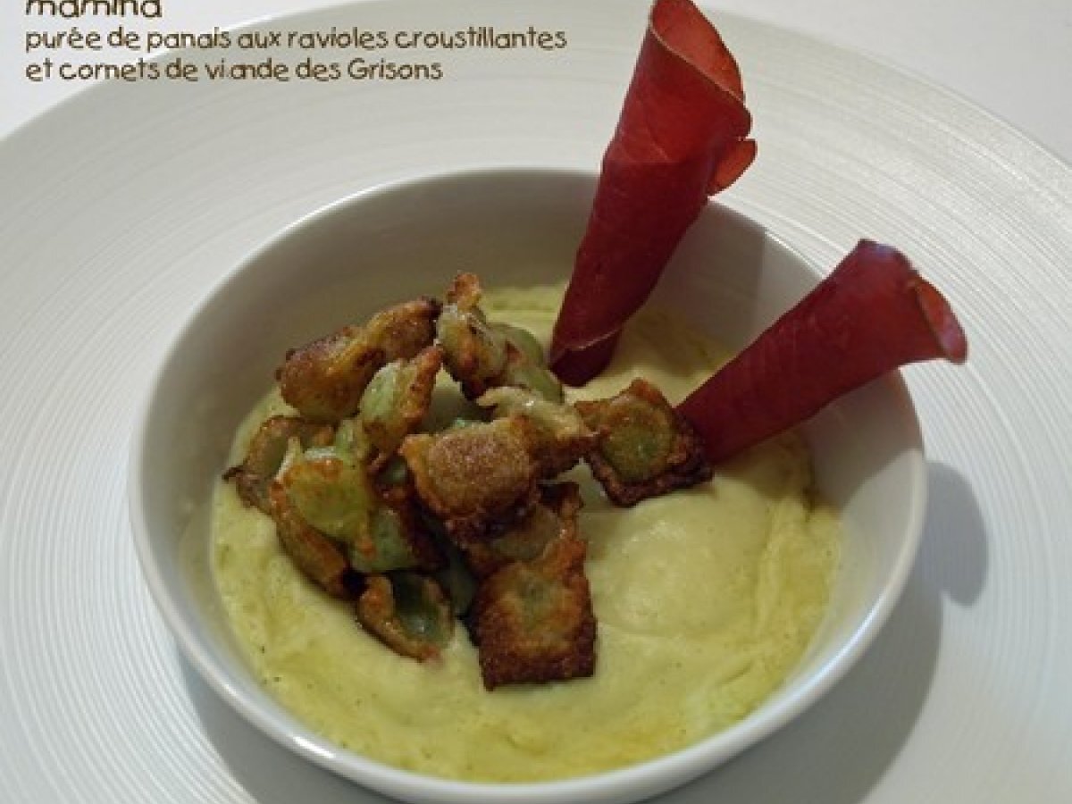 Purée de panais au croustillant de ravioles et viande des grisons, ou au foie gras