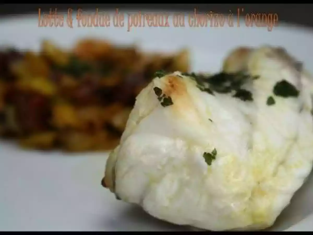 ** queue de lotte rôtie au four et fondue d'émincé de poireaux au chorizo ** PrécédentSuivant Platfacile1 h 3 m Envoyer cette recette à un ami Imprimer cette page Poser une question à l'auteur Publier votre photo de cette recette Ingrédients 2 Lotte rôtie au four : 300 g de lottes ( 2 filets de 150 G) Le jus d'une demie orange 1 cuillère à soupe d'huile d'olive Sel, poivre Eventuellement de la coriandre en feuille ( ici surgelée ) Fondue de poireaux au chorizo à l'orange : 1 poireaux 1 grosse échalotte 50 G de chorizo ( de qualité) le jus d'une demie orange 1 petite cuillère à soupe d'huile olive Sel, poivre