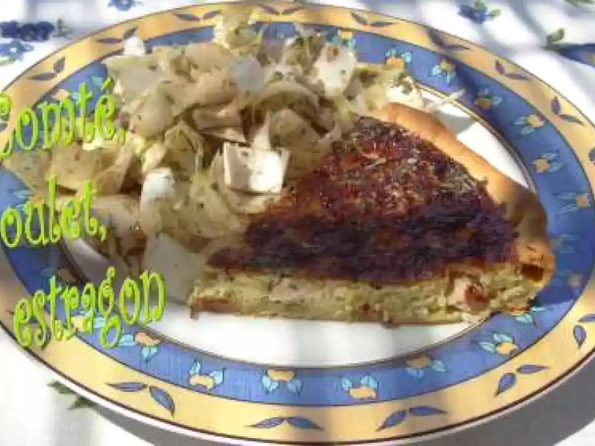 Quiche au comté, au poulet et à l'estragon PrécédentSuivant Platfacile1 heure Envoyer cette recette à un ami Imprimer cette page Poser une question à l'auteur Publier votre photo de cette recette Ingrédients 6 1 pâte brisée 20cl de crème légère 3 ufs 100g de comté râpé 150g de dés de volaille 1 c à s de moutarde à lestragon 1 c à s destragon coupé Sel, poivre