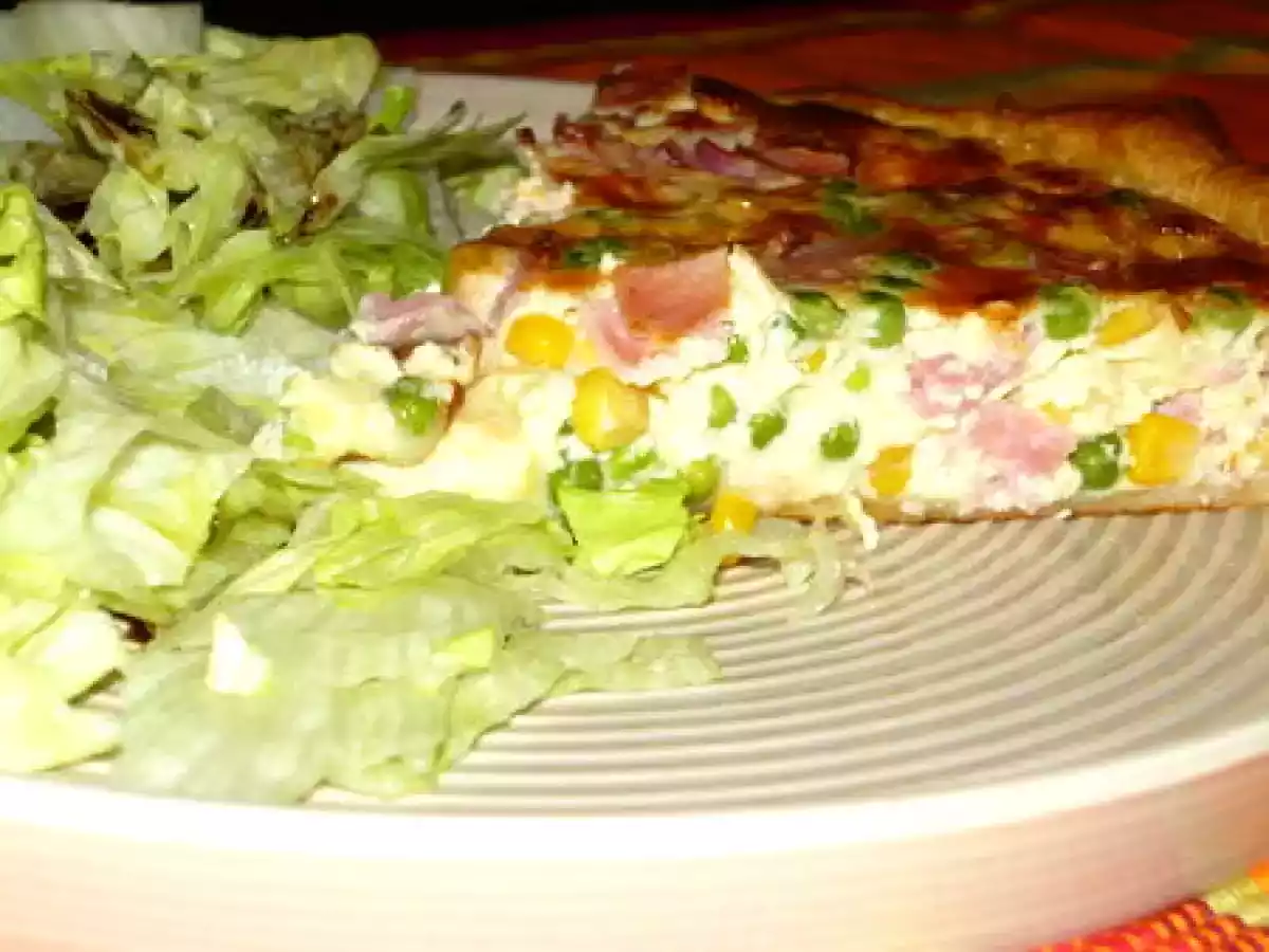 Quiche au maïs, petits pois et jambon votez maintenant Platfacile42 min Envoyer cette recette à un ami Imprimer cette page Poser une question à l'auteur Publier votre photo de cette recette Ingrédients 4 1 rouleau de pâte feuilletée 1 petite boîte de maïs (140 g) 5 tranches de jambon 100 g de petits pois cuits 50 g d'olives vertes en rondelles 65 g de munter en dés 50 g de gruyère râpé 3 oeufs 25 cl de crème liquide sel poivre muscade