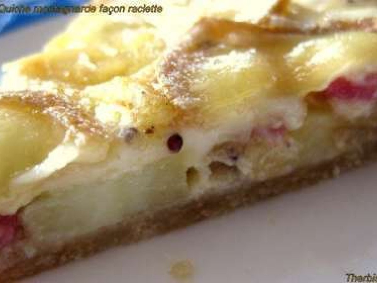 Quiche montagnarde façon raclette PrécédentSuivant Platfacile50 min Envoyer cette recette à un ami Imprimer cette page Poser une question à l'auteur Publier votre photo de cette recette Une merveille ! Ingrédients 6 Pâte à tarte : 200 g de farine (mis de la T80) 50 g de flocons d'avoine 5 càs d'huile d'olive 10 cl d'eau (environ) 1/2 càc de sel Garniture : 2 oeufs 20 cl de crème de riz (ou crème fraîche classique) 200 g de lardons 1 oignon (petit) 200 g de pommes de terres cuites à l'eau (rattes du touquet, reste de raclette) 15 lamelles de fromage à raclette au poivre et au cumin (de quoi couvrir la tarte) Sel Poivre Mscade