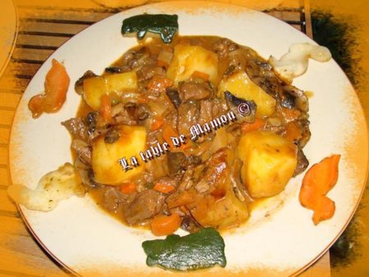 Ragoût de boeuf aux légumes et pommes de terre Platfacile3 h 20 m Envoyer cette recette à un ami Imprimer cette page Poser une question à l'auteur Publier votre photo de cette recette Ingrédients 4 1 kg de paleron 1 filet d'huile d'olive 1 oignon 1 courgette 3 carottes 1/2 céleri rave 2 cuillères à soupe de concentré de tomate 1/4 l de vin rouge 1/4 l de vin blanc 1/2 l d'eau Sel, poivre du moulin,2 cuillères à café de paprika, thym 10 pommes de terre 300 g de champignons de Paris