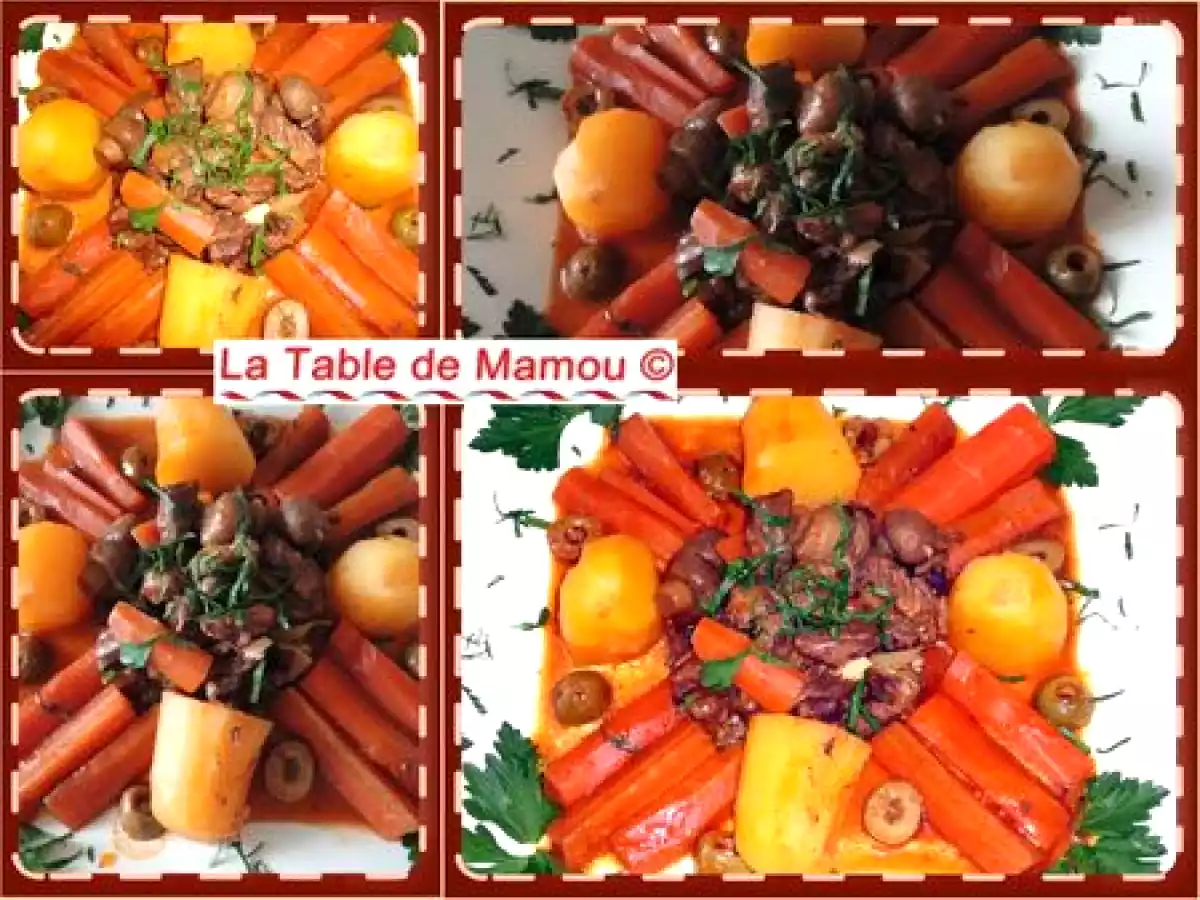 Ragoût de boeuf aux olives, carottes et pommes de terre PrécédentSuivant Platmoyen50 min1503 Kcal Envoyer cette recette à un ami Imprimer cette page Poser une question à l'auteur Publier votre photo de cette recette Ingrédients 4 1.200 kg de boeuf bourguignon, 2 oignons, 1 grosse échalote, 10 gousses d?ail, 3 belles branches de persil plat, 6 carottes, 15 branches de thym, 3 feuilles de laurier, Sel, poivre du moulin, 25 cl de vin blanc, 75 cl de vin rosé, 1 noisette de beurre salé, huile d?olive, 3 cuillères à soupe de concentré de tomate, Piment d'Espelette, 1 cuillère à café de miel de thym, 1 boite de champignons de Paris, 2 tasses d'eau, 20 olives vertes dénoyautées, 20 petites pommes de terre. Coût estimé: 35.16Euros€ (8.79€/part)