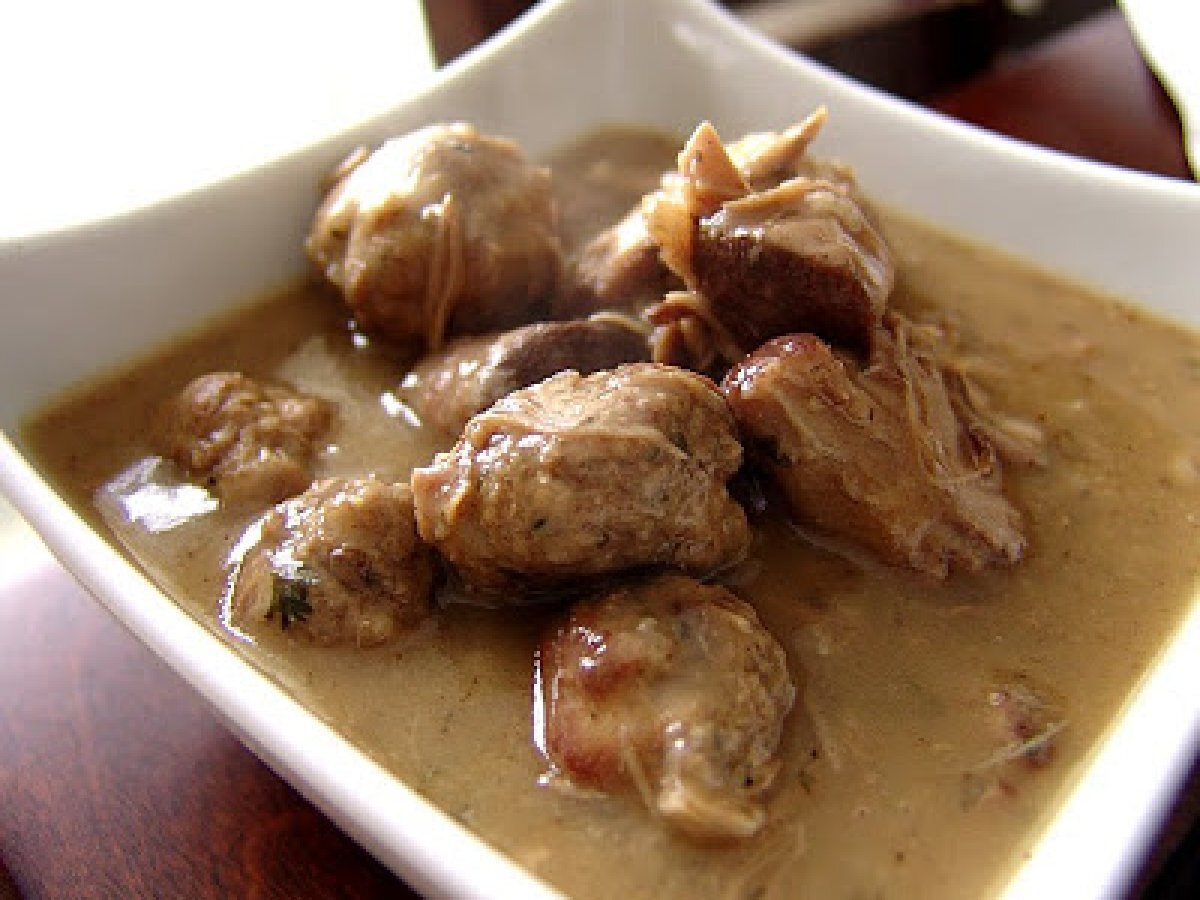 Ragoût de pattes de porc (notre tradition) PrécédentSuivant Platfacile2 h 40 m Envoyer cette recette à un ami Imprimer cette page Poser une question à l'auteur Publier votre photo de cette recette Ingrédients 6 Pour les pattes : 6 à 8 morceaux coupés de pattes de porc 1/2 cuillère à thé de cannelle moulue 1/2 cuillère à thé de clou girofle moulu 1/4 cuillère à thé de muscade moulue 1/2 cuillère à thé de poudre d'ail Sel de guérande Poivre d'Isabelle Pour le bouillon : 2 boîtes de consommés de boeuf liquide concentré 2 boîtes de bouillon de poulet liquide concentré 1 cuillère à thé de cerfeuil séché 1 cuillère à thé de persil séché 4 tasses d'eau froide 1 feuille de laurier Sel et poivre Pour les boulettes : 1 1/2 lbs de boeuf haché maigre 1 1/2 lbs de porc haché maigre 1 oignon haché fin 1 cuillère à thé de persil séché 1/2 cuillère à thé de cannelle moulue 1/4 cuillère à thé de gingembre moulu 1/2 cuillère à thé de moutarde en poudre 1/2 tasse de mélange de farce pour dinde ou poulet Sel et poivre Farine en quantité suffisante Pour finir : 1/4 de tasse de vin rouge 2 à 4 poitrines de poulet désossés en cubes Farine grillée pour épaissir la sauce