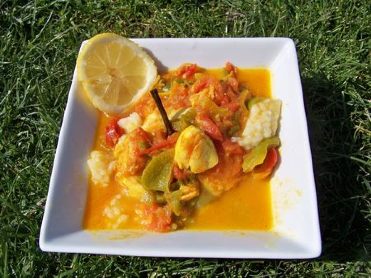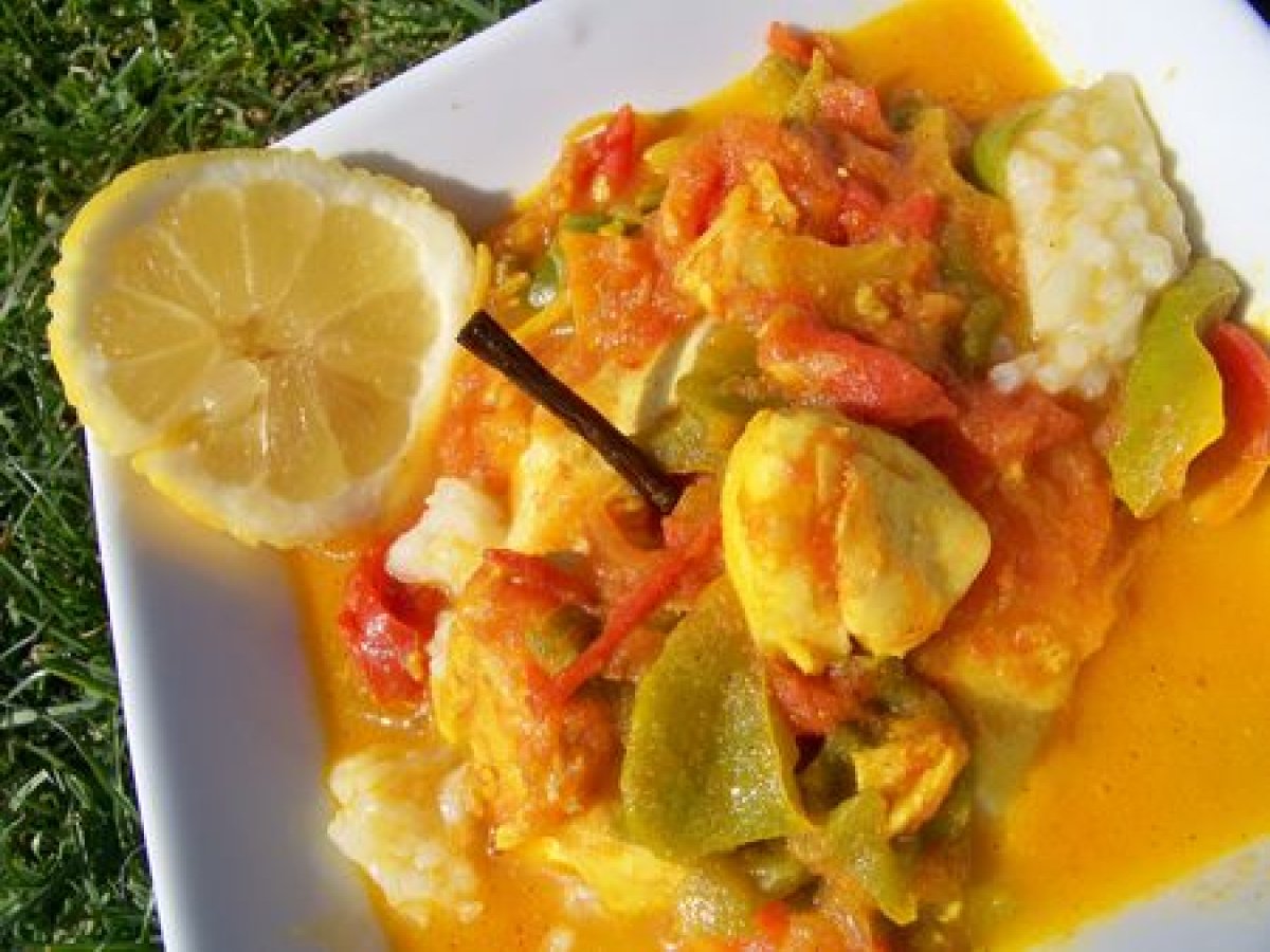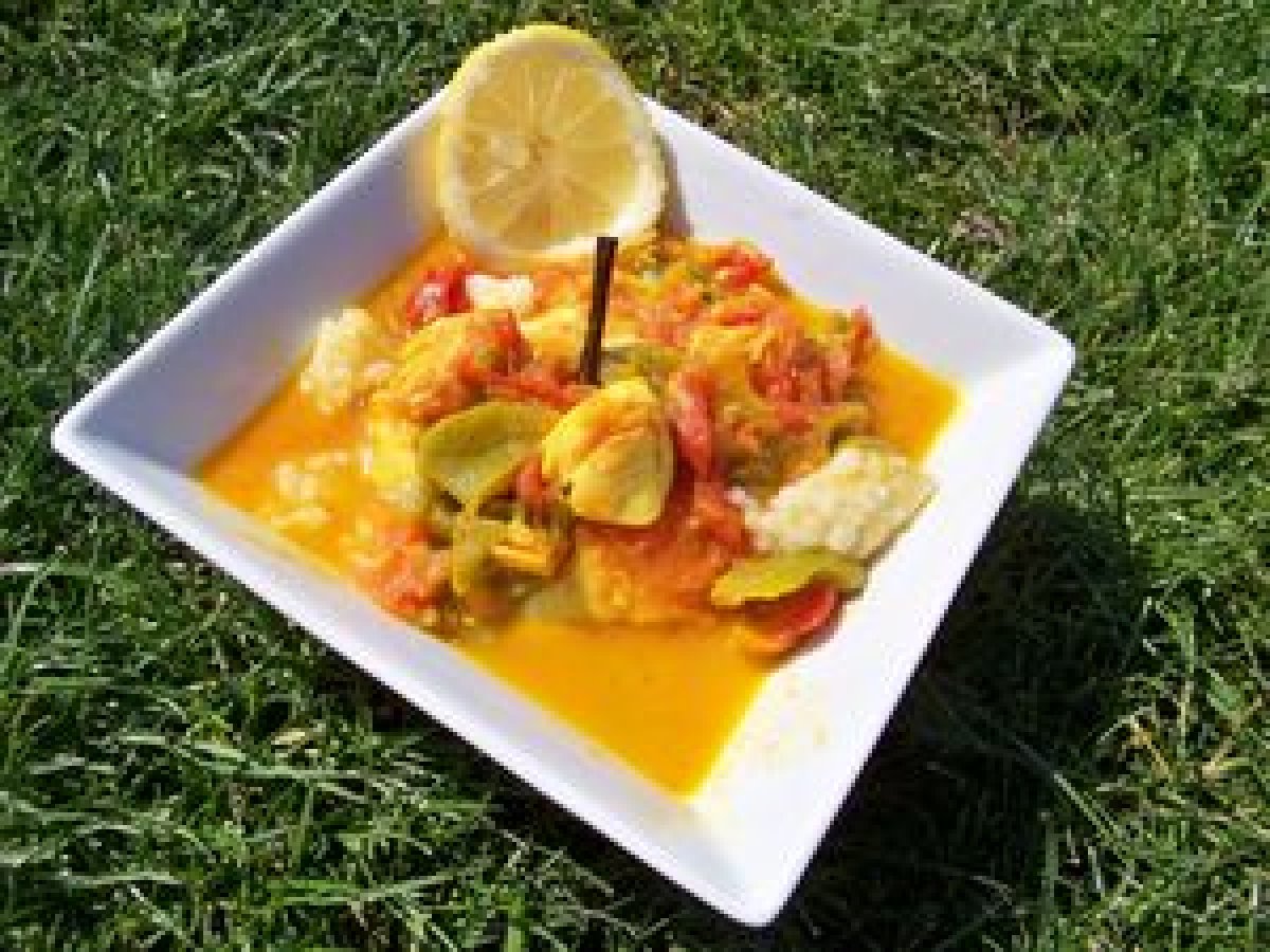 Ragôut de poisson a la mauricienne "pour le tour du monde en 232 recettes votez maintenant PrécédentSuivant Platfacile35 min Envoyer cette recette à un ami Imprimer cette page Poser une question à l'auteur Publier votre photo de cette recette Ingrédients 2 1 morceau de poisson blanc pour 2 personnes 1/4 de piment rouge épépiné et finement émincé 1 poivron vert épépiné et coupé en morceaux de 1 cm 2 tomates bien mûres,épépinées et coupées en morceaux de 1 cm quelques tranches de citron vert 1/2 gousse de vanille 1 cuillère à soupe de cumin cuillère à soupe de curcuma 1 cuillère à soupe d'huile d'olive 1 gousse d'ail écrasée coriandre ou basilic