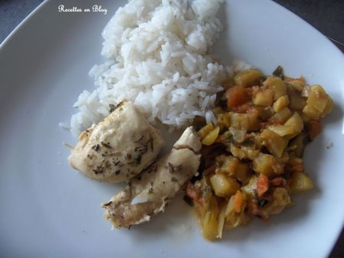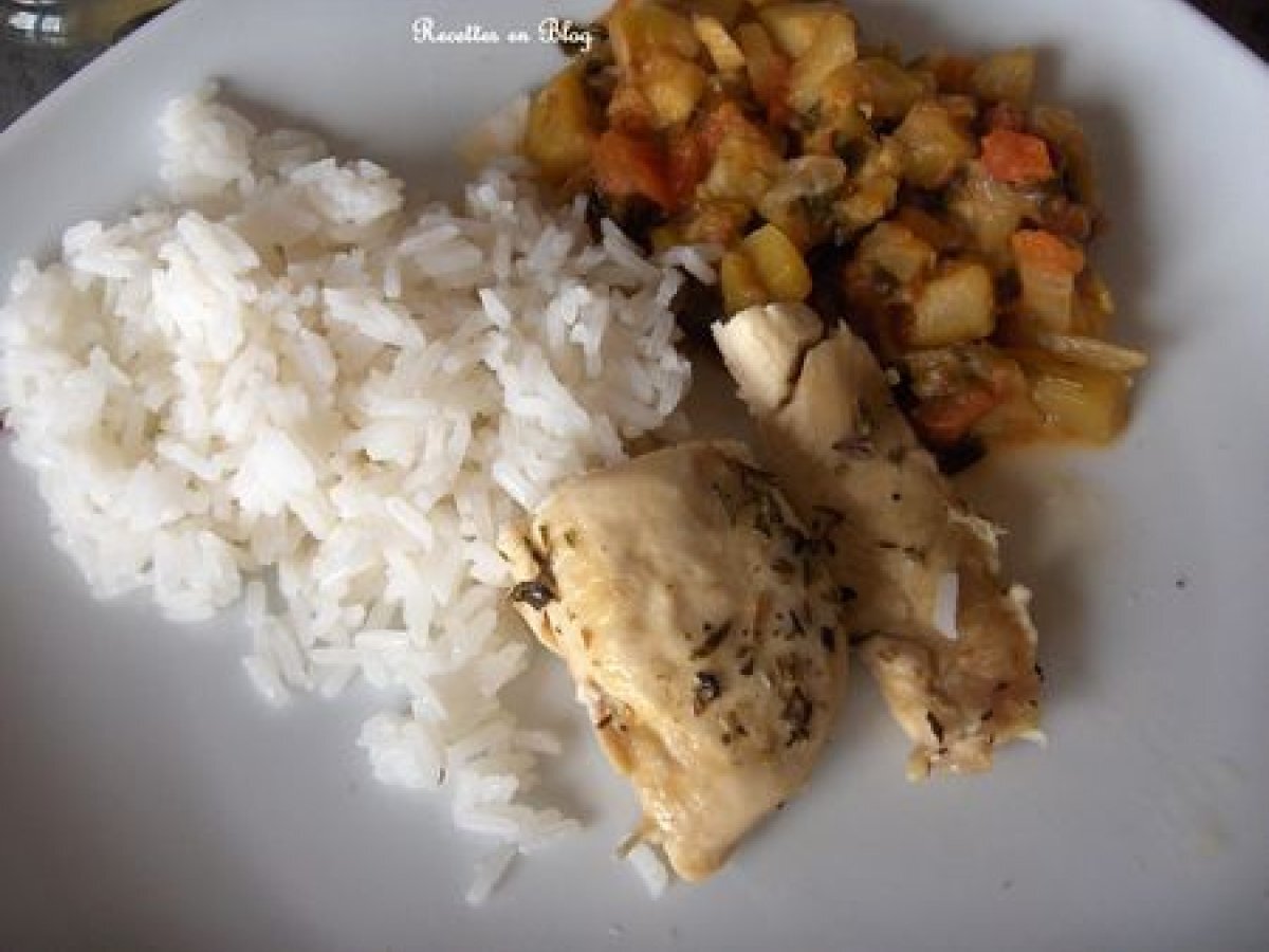 Ratatouille poulet et riz thai votez maintenant PrécédentSuivant Platfacile50 min438 Kcal Envoyer cette recette à un ami Imprimer cette page Poser une question à l'auteur Publier votre photo de cette recette Ingrédients 8 1 kg de courgettes 5 tomates 1 poivron 1 aubergine 8 filets de poulet herbes de Provence 1 citron sel et poivre 4 verres de riz thaï 1 oignon 2 gousses d'ail 2 cuillères à soupe d'huile d'olives Coût estimé: 16.98Euros€ (2.12€/part)