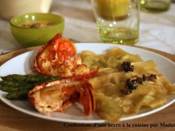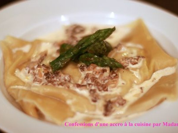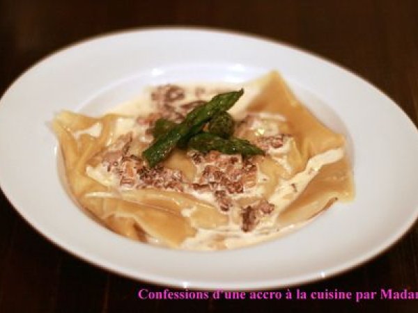 Ravioles d'asperges au lard et parmesan, crème aux morilles PrécédentSuivant Platfacile18 min Envoyer cette recette à un ami Imprimer cette page Poser une question à l'auteur Publier votre photo de cette recette Ingrédients 4 24 feuilles de pâtes à raviolis wontons 1 blanc d'oeuf 2 cubes de bouillon de légumes 25 g de beurre Pour la farce: 500 g d'asperges vertes 50 g de lardons 50 g de parmesan 1 petite gousse d'ail 5 cl de crème liquide Pour la sauce: 20 cl de crème liquide 100 g de morilles fraîches 1 échalote 1 noix de beurre 3 cl de vin blanc doux ou de porto blanc