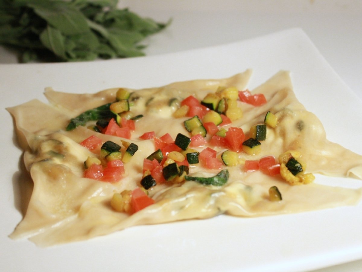 Ravioles farcies de fromage frais et de courgettes revenues à l'huile d'olive, nappées de beurre infusé à la sauge