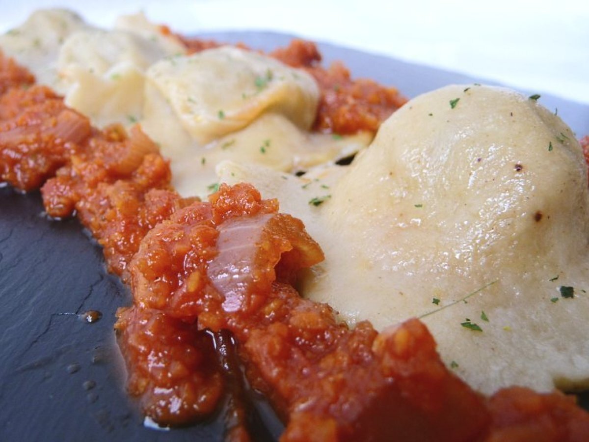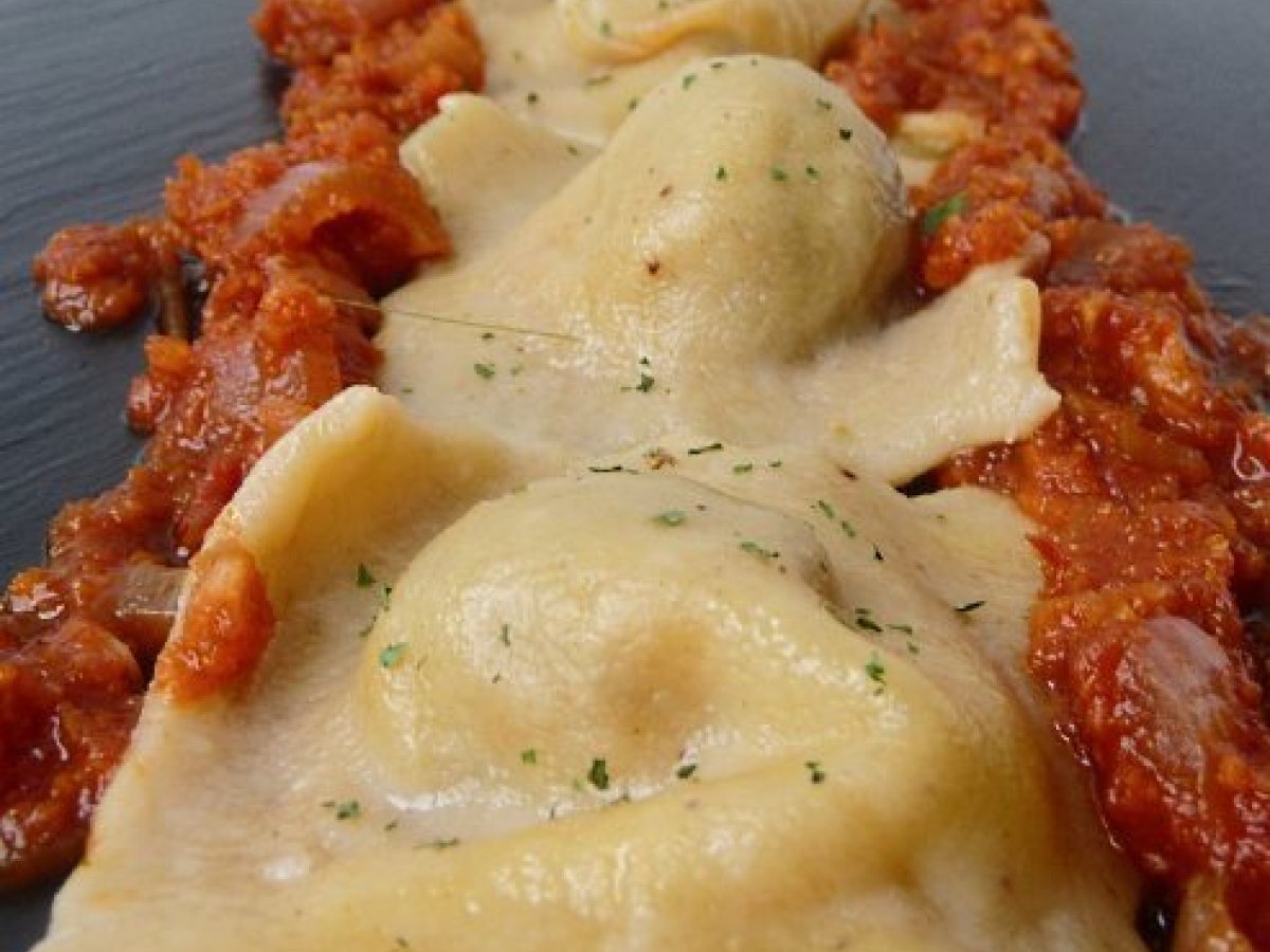 Raviolis épicés à la viande et à la sauce tomates PrécédentSuivant Platmoyen1 h 45 m Envoyer cette recette à un ami Imprimer cette page Poser une question à l'auteur Publier votre photo de cette recette Ingrédients 2 Pour la pâte 2 oeufs 200g de farine 2cs dhuile dolive 2cs deau 1cc rase de 4 épices Pour la farce 2 steaks hachés 2 échalotes épluchées 3 grains de poivre noir d'Inde 1cs de persil 1cc de paprika Pour la sauce tomates 1cs dhuile dolive 1 échalote épluchée et émincée 1 oignon épluché et émincé 1 carotte épluchée et hachée 1/2 branche de céleri hachée 1 boîte de pulpe de tomates 1/2 cube de bouillon de légumes 1 pincée de sucre 5cl de vin rouge 1 pincée de cannelle en poudre 2 feuilles de laurier 1 branche de romarin 1 branche dorigan