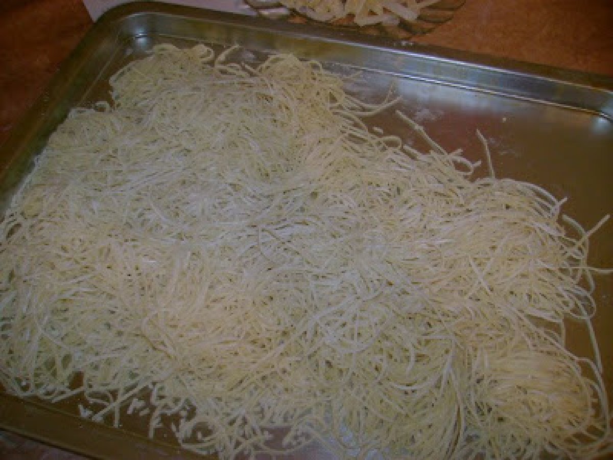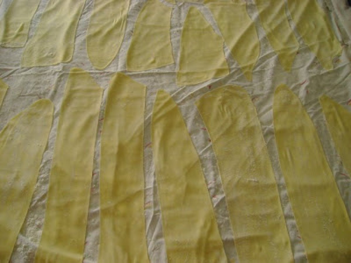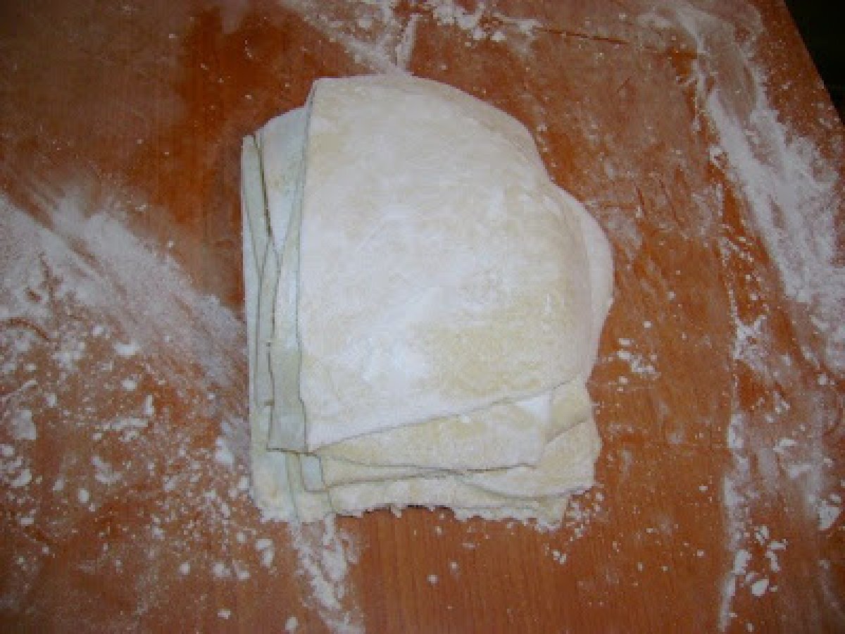 On saupoudre chaque morceau de maïzena et on les superpose on repasse encore une fois mais au plus fin, au n°5 ou 6, on met sur un linge propre (un drap ou une grande nappe saupoudrée de maïzena) et on laisse sécher .