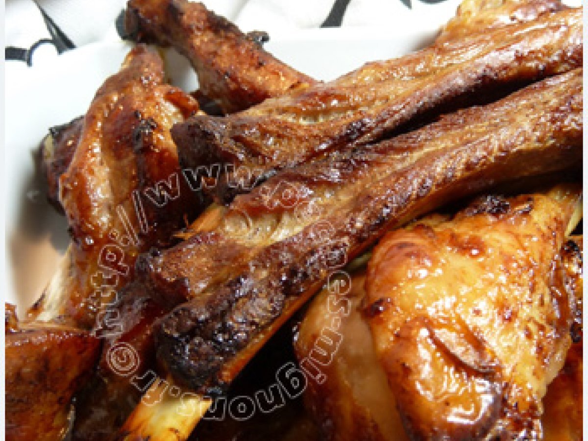 Ribs et poulet marinés au jus de pomme PrécédentSuivant Platfacile1 h 25 m Envoyer cette recette à un ami Imprimer cette page Poser une question à l'auteur Publier votre photo de cette recette Ingrédients 8 8 ribs 8 morceaux de poulet (cuisses et avant cuisses) 250 ml de jus de pomme 60 ml de sirop d’érable 30 ml d’huile végétale 30 ml de sauce soja 2 anis étoilés ou badiane 1 bâton de cannelle 6 gousses d’ails pelées