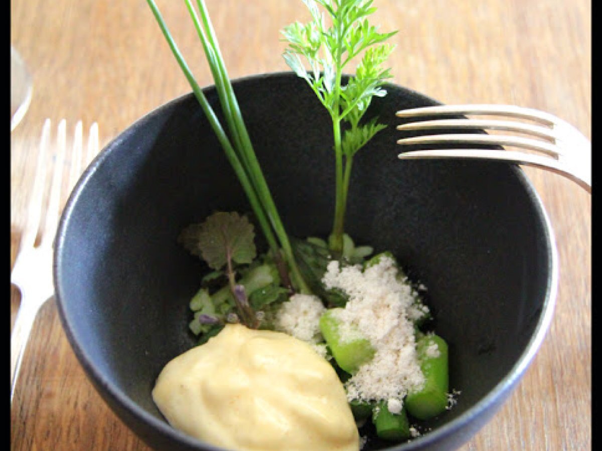 Risotto à l'ail des ours, asperges vertes, mousse de beurre au yuzu. votez maintenant Platfacile25 min Envoyer cette recette à un ami Imprimer cette page Poser une question à l'auteur Publier votre photo de cette recette Ingrédients 4 50 g de riz à risotto 1 cuillère à café d'échalotes hachées 10 cl de vin blanc sec 20 cl de fond de volaille 80 cl d'eau 5 feuilles d'aïl des ours 12 asperges vertes moyenne 4 mini carottes 4 mini oignons rouge 4 mini oignons blancs 4 mini poireaux Pour le beurre au Yuzu : 100 g de beurre non salé 25 g de blanc d'oeuf frais 20 g de jus de yuzu 1,5 g de sel Garnitures: quelques fleurs d'aïl des ours quelques fleurs de primevère sauvage