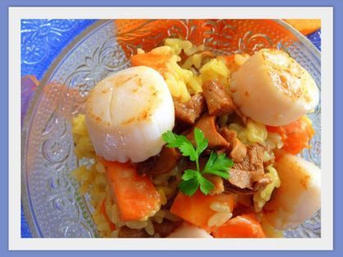 Risotto à la courge et aux coquilles st jacques Platmoyen1 h 10 m Envoyer cette recette à un ami Imprimer cette page Poser une question à l'auteur Publier votre photo de cette recette Ingrédients 4 200 gr de riz arborio ( spécial risotto) 400 gr de courge musquée pelée et épépinée 2 échalotes 250 gr de chanterelles 40 gr de beurre 3 c à soupe de parmesan 1 c à soupe de crème épaisse 2 c à soupe d'huile d'olive 15 cl de vin blanc sec 30 à 40 cl de bouillon cube 1 pincée de pistils de safran sel poivre