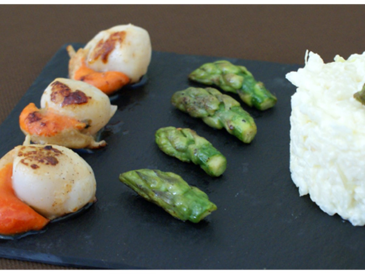 Risotto aux asperges vertes et noix de st jacques votez maintenant Platfacile35 min564 Kcal Envoyer cette recette à un ami Imprimer cette page Poser une question à l'auteur Publier votre photo de cette recette Ingrédients 4 Les noix de St Jacques : 16 noix de st Jacques (compter 3 à 4 St Jacques par personne) Une noix de beurre Quelques pincées de fleur de sel Poivre Le risotto : 1,5 l d'eau 2 cubes de bouillon de légumes 1 filet d'huile d'olive 2 petites échalotes 270 g de riz arborio 5 cl de vin blanc sec 30 g de parmesan râpé 15 cl de crème liquide Sel poivre Les asperges : 1 botte d’asperges vertes (soit 14 asperges) Gros sel Une noix de beurre (pour les pointes) Sel poivre (pour les pointes)