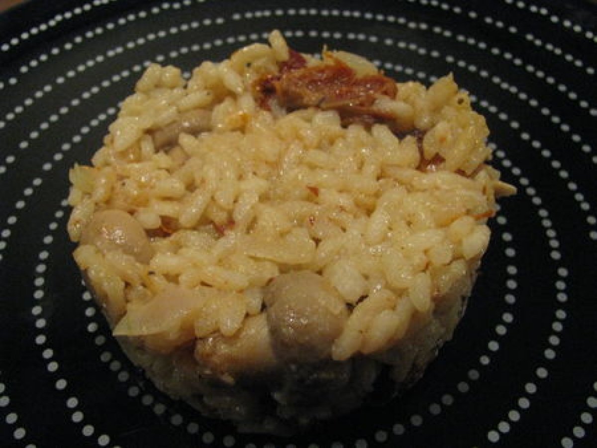 Risotto aux champignons, tomates séchées et aiguillettes de poulet rôti