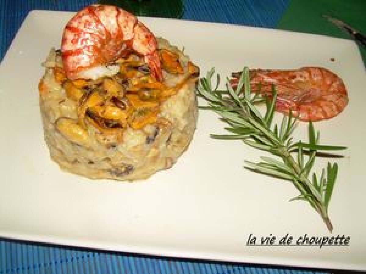 Risotto aux moules marinieres et aux gambas Platfacile1 h 5 m644 Kcal Envoyer cette recette à un ami Imprimer cette page Poser une question à l'auteur Publier votre photo de cette recette Ingrédients 2 150 g de riz arborio moules 6 gambas surgelées 1 gousse d'ail 1 échalote 2 cuillère à soupe de crème épaisse 50 g de gruyère râpé 2 pincées de piment d'Espelette huile d'olive poivre