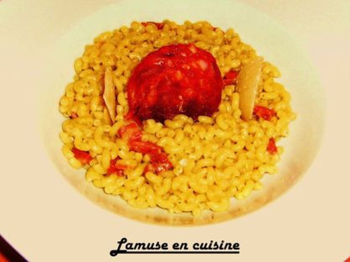 Risotto de coquillettes au chorizo de cyril lignac Platfacile25 min792 Kcal Envoyer cette recette à un ami Imprimer cette page Poser une question à l'auteur Publier votre photo de cette recette Ingrédients 2 175 g de coquillettes 1 oignon 5 cl de vin blanc 50 cl de bouillon de volaille 75 g de chorizo 50 g de parmesan 40 g de beurre sel poivre Coût estimé: 3Euros€ (1.5€/part)