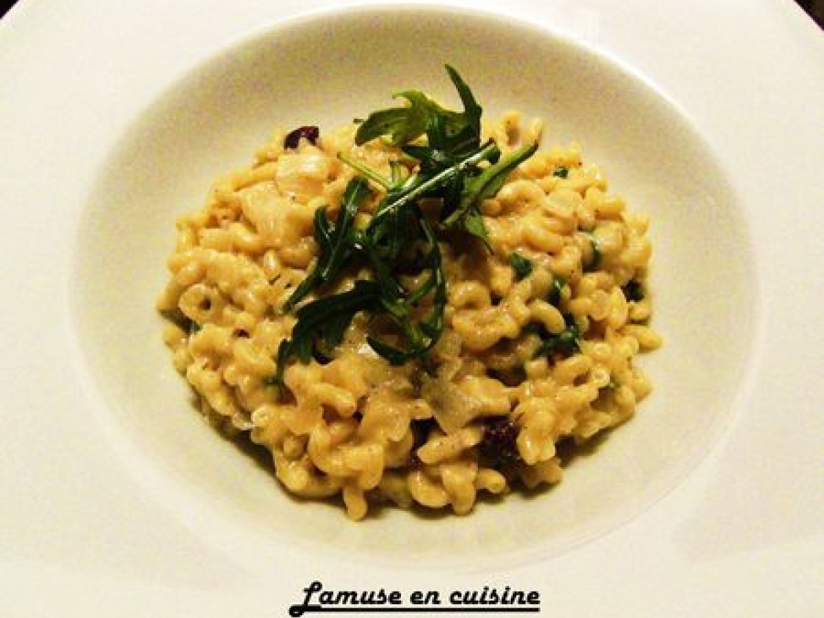 Risotto de coquillettes roquette saint felicien et noisettes grillées Platfacile15 min418 Kcal Envoyer cette recette à un ami Imprimer cette page Poser une question à l'auteur Publier votre photo de cette recette Ingrédients 2 160 g de coquillettes 1 petit oignon 5 cl de vin blanc 50 cl de bouillon de volaille 1 cuillère à soupe d'huile d'olive 1/2 saint félicien Une dizaine de noisettes 1 grosse poignée de roquette sel poivre Coût estimé: 1.6Euros€ (0.8€/part)