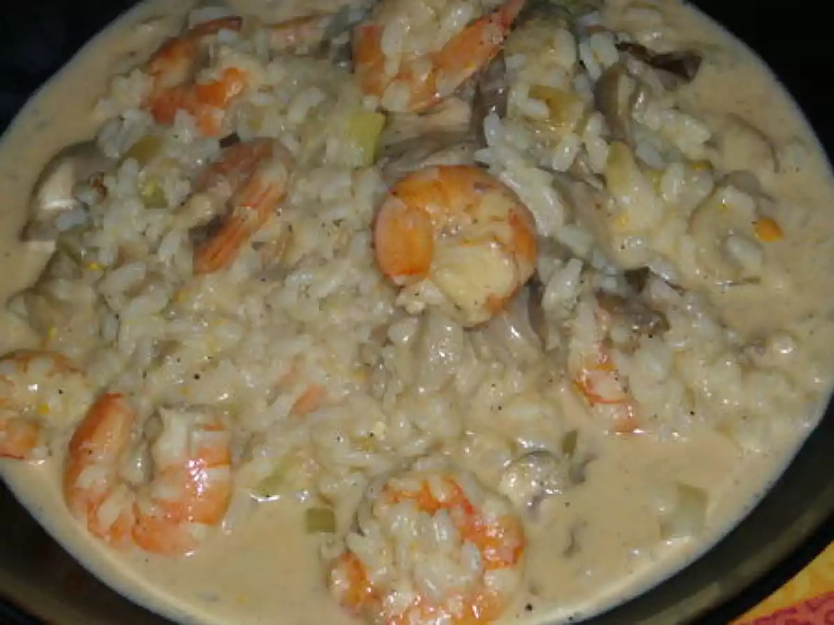 Risotto en sauce onctueuse, aux crevettes et pleurottes votez maintenant Platfacile52 min Envoyer cette recette à un ami Imprimer cette page Poser une question à l'auteur Publier votre photo de cette recette Ingrédients 2 125 g de riz arborio 6 beaux champignons de Paris 1 belle poignée de pleurotes 500 g de crevettes ( soit 250 g décortiquées) 1 verre de noilly prat 15 cl de crème liquide 1 bûche de port salut en baguette ( fromage) 1 grosse échalote 1/2 oignon 4 cuillères à soupe ( plus si vous aimez) de sauce nem 2 grosses cuillères à soupe de confiture d'oignons ( rayon produits espagnoles de votre grande surface) 1/2 cuillère à café de purée de piment 1/ cuillère à café de poivre un peu de sel