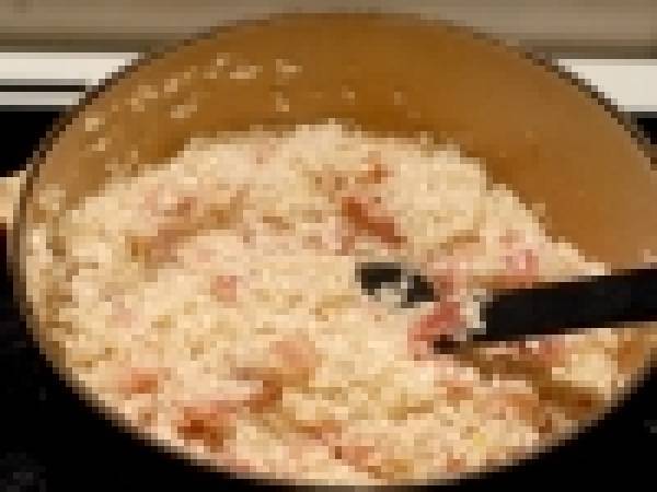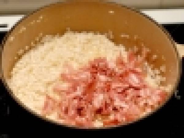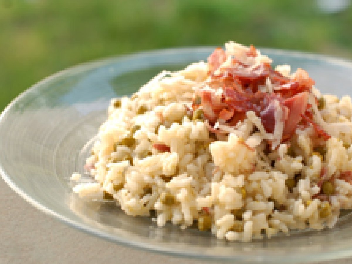 Risotto pancetta et petits pois Platfacile55 min Envoyer cette recette à un ami Imprimer cette page Poser une question à l'auteur Publier votre photo de cette recette Ingrédients 5 500 g de riz à risotto Arborio 1 gros oignon 15 cl de vin blanc de cuisine 1 litre d’eau bouillante avec 2 bouillons Kub Or 12 tranches de Pancetta ronde 250 g de petits pois 50 g de parmesan Sel Poivre huile d’olive