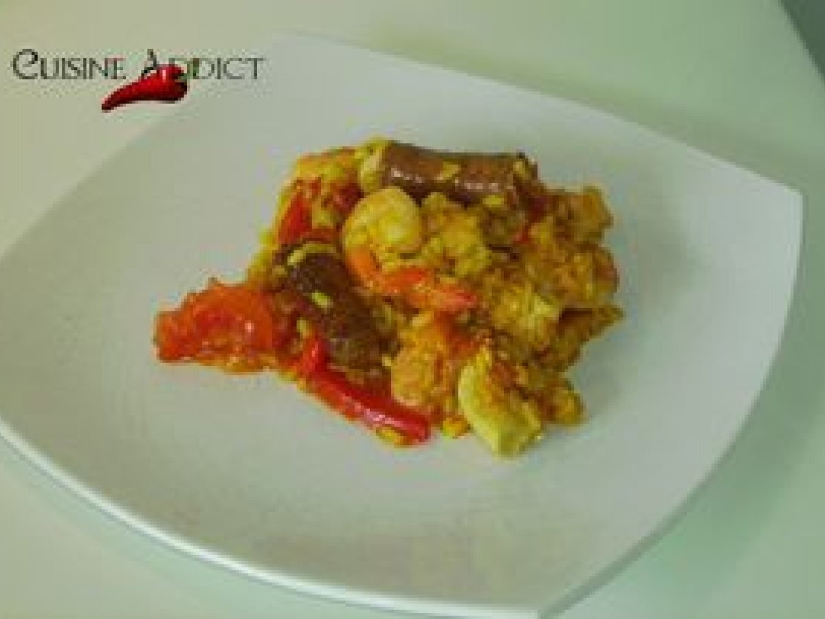 Riz jambalaya votez maintenant Platfacile1 heure585 Kcal Envoyer cette recette à un ami Imprimer cette page Poser une question à l'auteur Publier votre photo de cette recette Ingrédients 6 3 escalopes de poulet 3 merguez 1 poivron rouge 1 poivron jaune 1/2 chorizo 10 tranches de bacon 2 cuillères à café de curcuma en poudre 1 cuillère à café de paprika doux 1 cuillère à café de curry 1 pincée de piment de Cayenne 1 oignon 2 gousses d'ail 400 g de riz rond 25 cl de bière 75 cl de bouillon 3 tomates 200 g de queues de crevettes décortiquées
