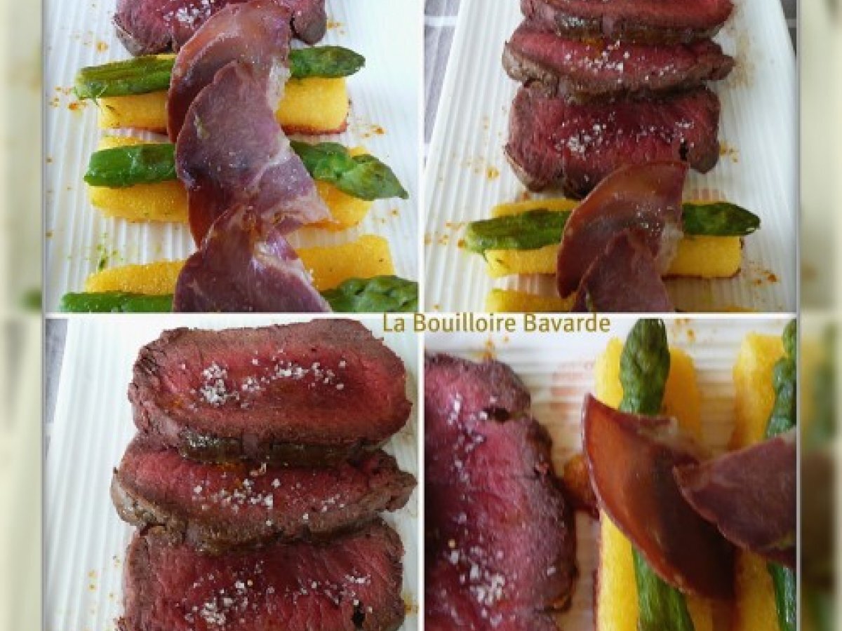 Rosbeef & sushis de polenta aux asperges et copa grillée votez maintenant PrécédentSuivant Platmoyen1 h 10 m Envoyer cette recette à un ami Imprimer cette page Poser une question à l'auteur Publier votre photo de cette recette Ingrédients 5 1,4 kg de rôti de boeuf, 3 gousses d'ail, 1 verre de polenta fine, 6 tranches de copa, 12 asperges vertes surgelées, sel, poivre.