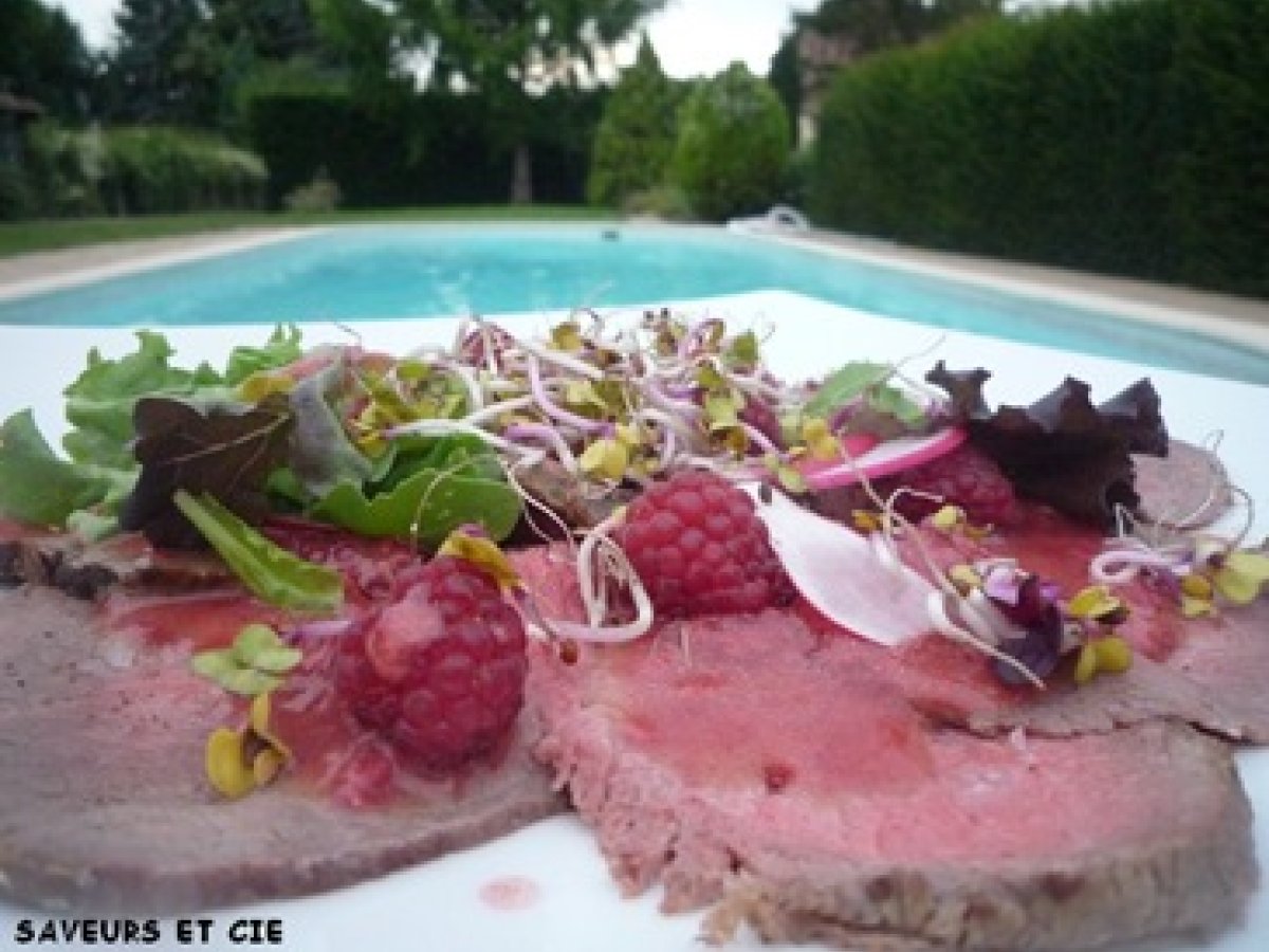 Rosbif, sauce acidulee aux framboises votez maintenant Platmoyen45 min Envoyer cette recette à un ami Imprimer cette page Poser une question à l'auteur Publier votre photo de cette recette Ingrédients 6 1 rosbif de 900 g environ 150 g de framboises 1 botte de radis 50 g de graines germées 1 cuillère.à soupe de moutarde forte 1 cuillère.à.soupe. de sauce soja 1 cuillère à.soupe de vinaigre de Xérès 4 cuillères.à.soupe d’huile d’olive Sel, poivre du moulin