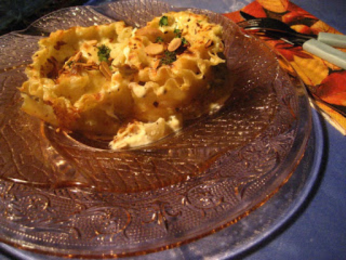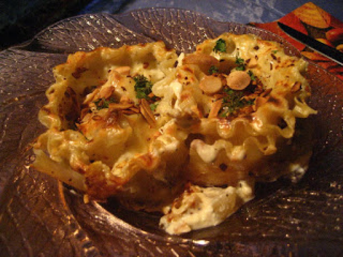 Rosettes de lasagnes au poulet, une recette pour le mois de l'ostéoporose votez maintenant PrécédentSuivant Platfacile1 heure Envoyer cette recette à un ami Imprimer cette page Poser une question à l'auteur Publier votre photo de cette recette Ingrédients 4 4 poitrines de poulet désossées ou 2 poitrines entières 1 oignon moyen, haché fin 250 g de champignons frais tranchés 1/4 tasse de beurre 3/4 tasse de vin blanc 1/2 cuillère à thé d'estragon 1/2 cuillère à thé chacun de sel et de poivre blanc 8 pâtes à lasagne, cuites et égouttées 1 tasse de crème légère 1 paquet de 250 g de fromage à la crème philadephia 2 tasses de fromage suisse râpé 1/4 tasse d'amandes effilées grillées Persil frais haché