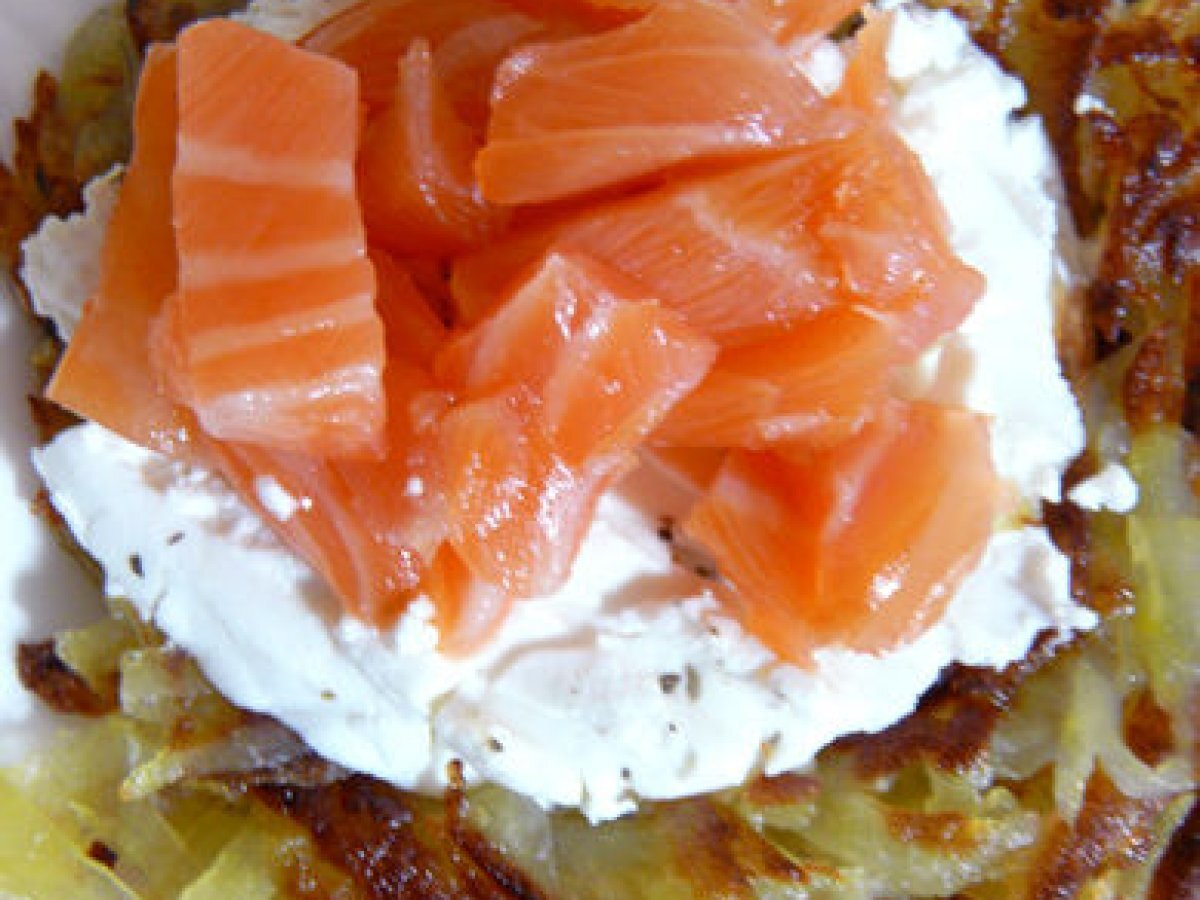 Rösti de pomme de terre, chèvre basilic et saumon fumé
