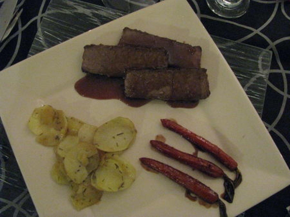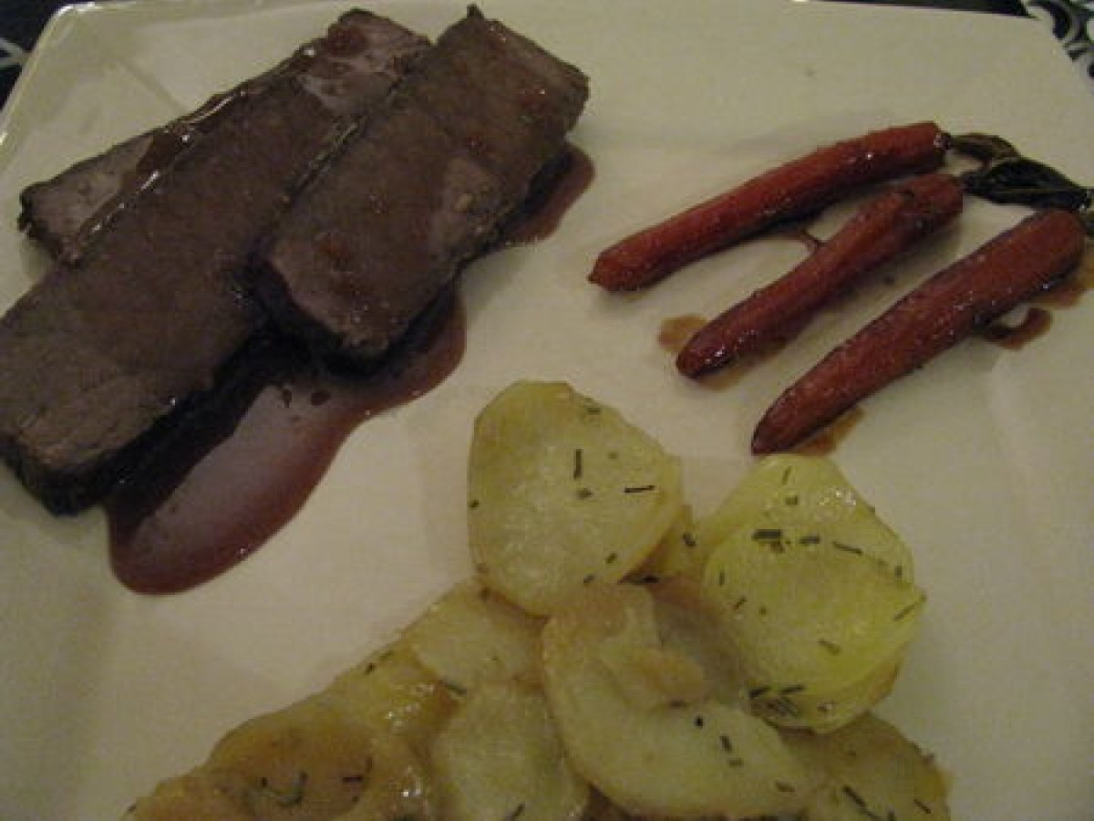 Rôti de boeuf à la gelée de groseille PrécédentSuivant Platfacile50 min Envoyer cette recette à un ami Imprimer cette page Poser une question à l'auteur Publier votre photo de cette recette Ingrédients 1 1 rôti de boeuf de 1.5 kg 2 feuilles de lauriers 2 cuillères à soupe d'huile d'arachide 60 ml de vinaigre de malt 50 g de sucre roux 8 grains de poivre 8 clous de girofle 1 oignon moyen 1 branche de céleri 1 verre de très bon vin rouge 800 g de carottes nouvelles 1 cuillère à soupe d'huile d'olive 2 gousses d'ail écrasées 200 ml de bouillon de poule Glaçage aux groseilles : 180 g de gelée de groseille 60 ml de porto 1 cuillère à soupe de feuilles de romarin frais
