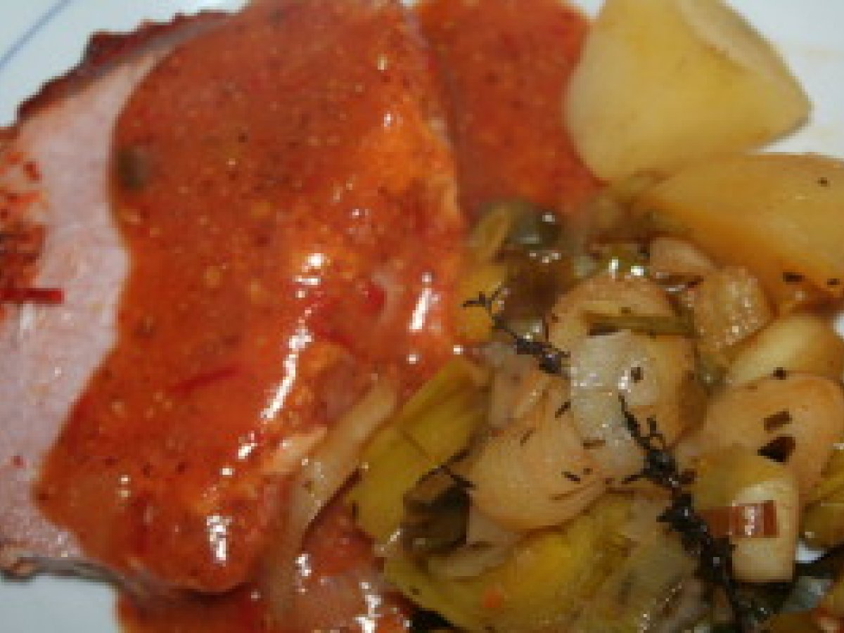 Rôti de porc à la moutarde et à la confiture de piments doux Platmoyen1 h 55 m994 Kcal Envoyer cette recette à un ami Imprimer cette page Poser une question à l'auteur Publier votre photo de cette recette Ingrédients 4 1 rôti de porc légèrement fumé 2 cuillères à soupe de moutarde 1 pot de confiture de piments doux 1 cubes de bouillon de boeuf liant pour sauce 1 kg de pommes de terre 4 poireaux huile d'olive 2 cubes de bouillon de légumes herbes de Provence thym paprika Coût estimé: 13.71Euros€ (3.43€/part)