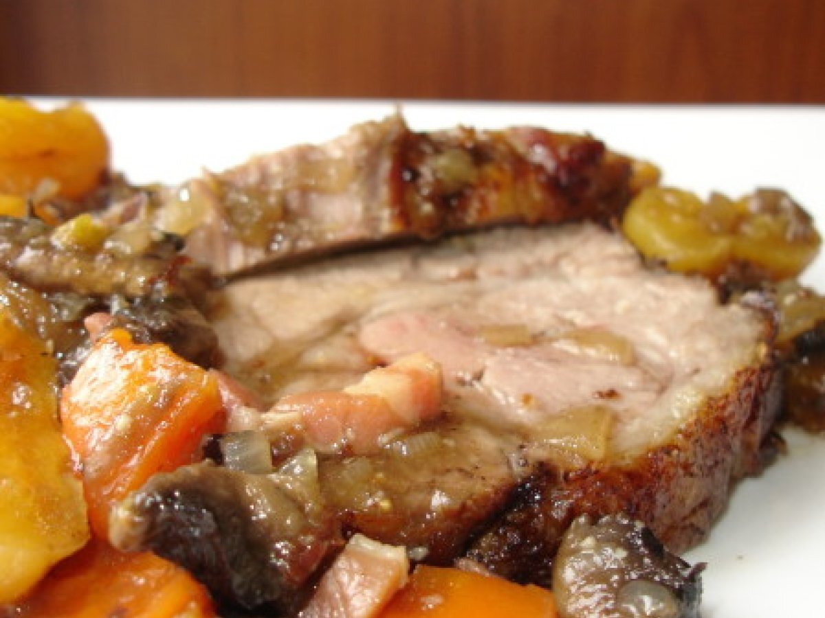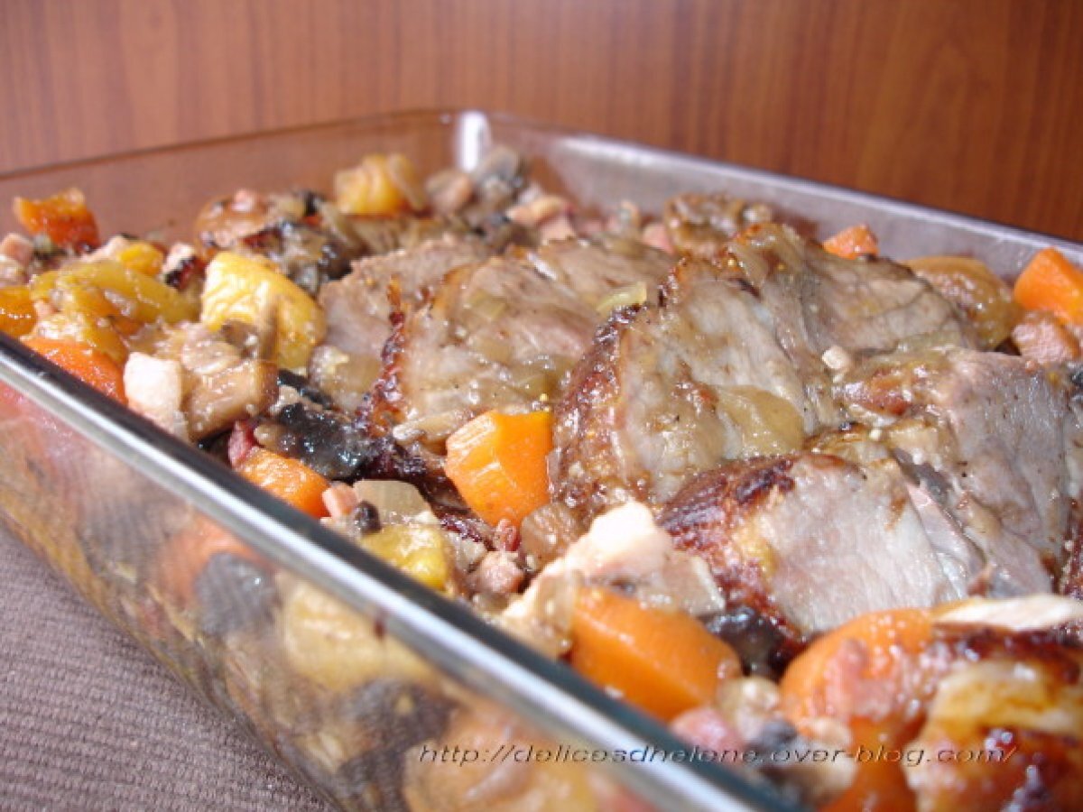 Roti de porc aux fruits secs votez maintenant PrécédentSuivant Platfacile1 h 30 m576 Kcal Envoyer cette recette à un ami Imprimer cette page Poser une question à l'auteur Publier votre photo de cette recette Ingrédients 6 1 rôti de porc dans le filet 200 g de lardons fumés 200 g de champignons de Paris 2 oignons 1 carotte ail en poudre 12 figues sèches moelleuses 200 g d'abricots secs moelleux 1 verre de vin blanc 15 cl de bouillon de boeuf poivre 4 épices huile d'olive Coût estimé: 20.41Euros€ (3.4€/part)