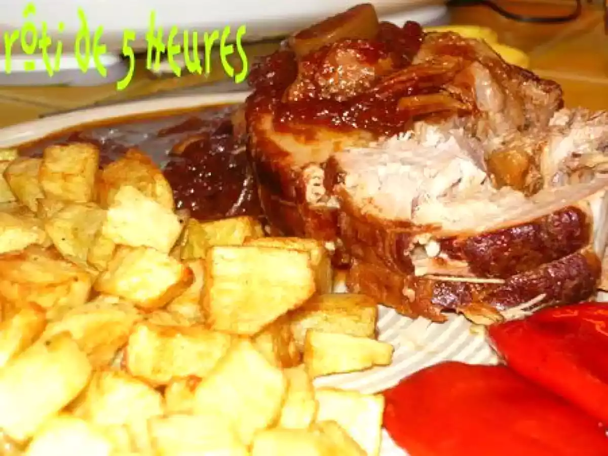 Rôti de porc de 5 heures, un régal alliant moutarde, ketchup Platfacile5 h 15 m Envoyer cette recette à un ami Imprimer cette page Poser une question à l'auteur Publier votre photo de cette recette Ingrédients 2 1 rôti de porc de 2 kg huile 400 g de tomates pelées 100 g de ketchup + 25 g de sauce barbecue 4 cuillères à soupe de sauce Worcestershire 1 cuillère à soupe de miel 2 cuillères à soupe de sauce soja 1 cuillère à soupe de moutarde 2 oignons émincés 5 gousses d'ail pelées coupés par la moitié 70 cl de vin blanc sec