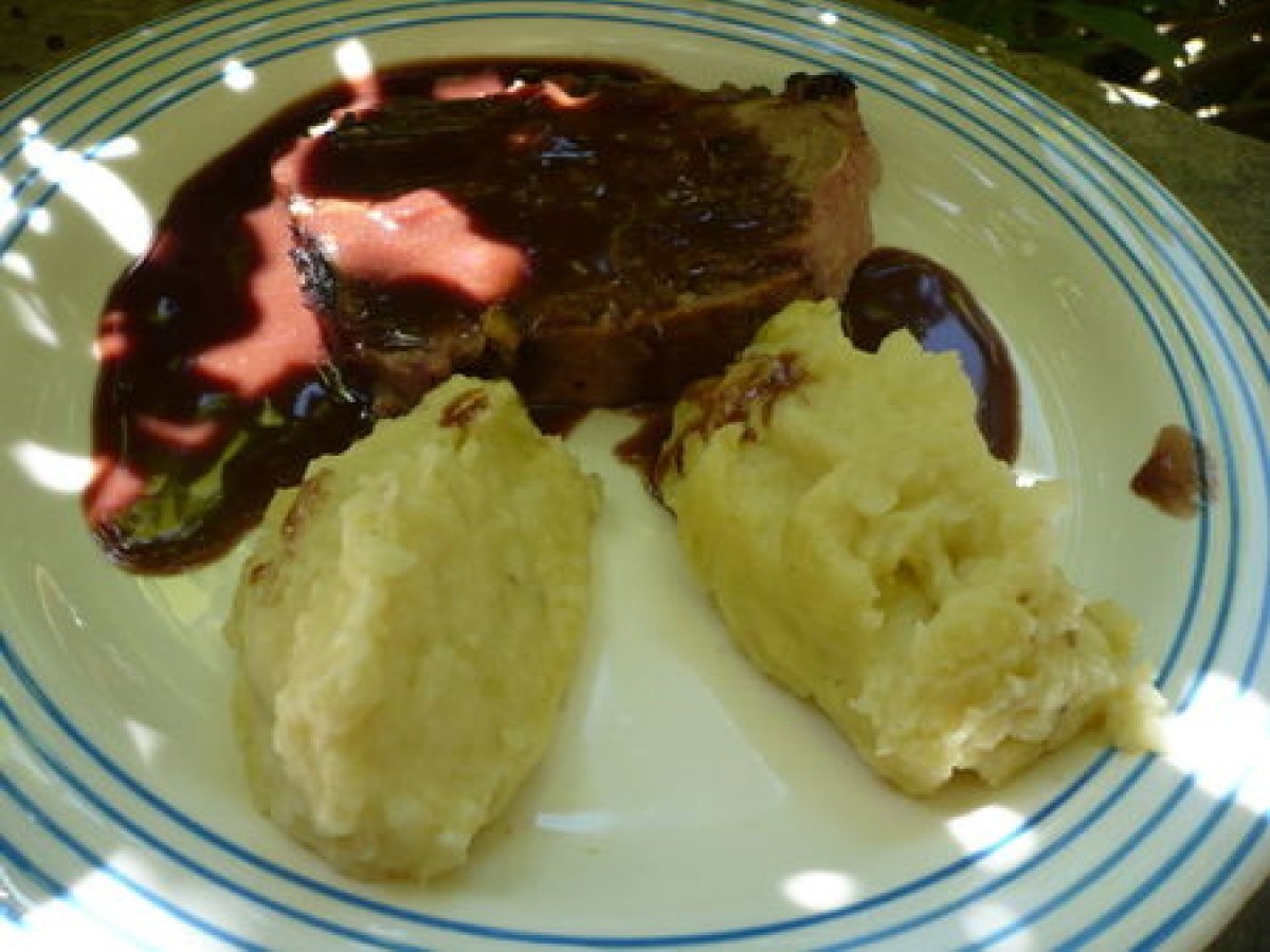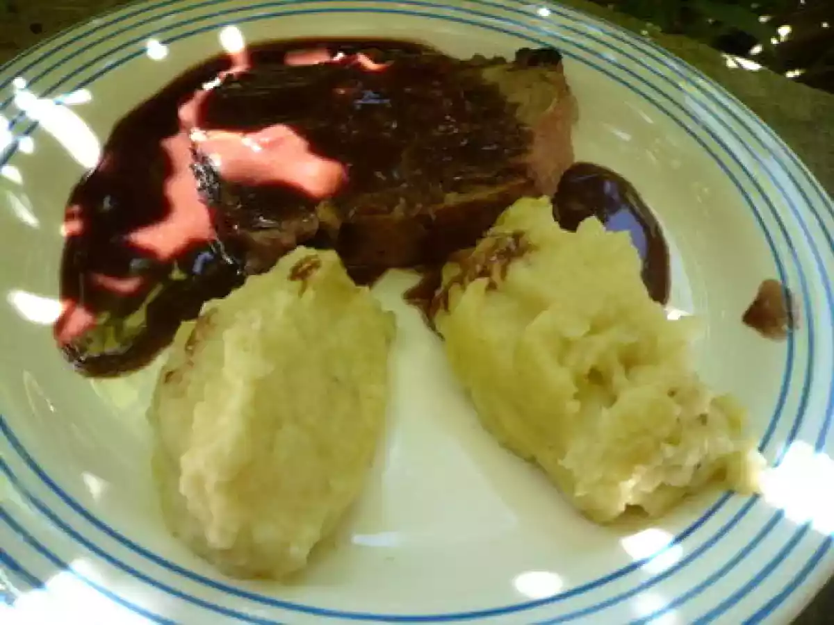 Rôti de porc mariné, sauce grand-veneur et purée de pommes de terre et céleri rave