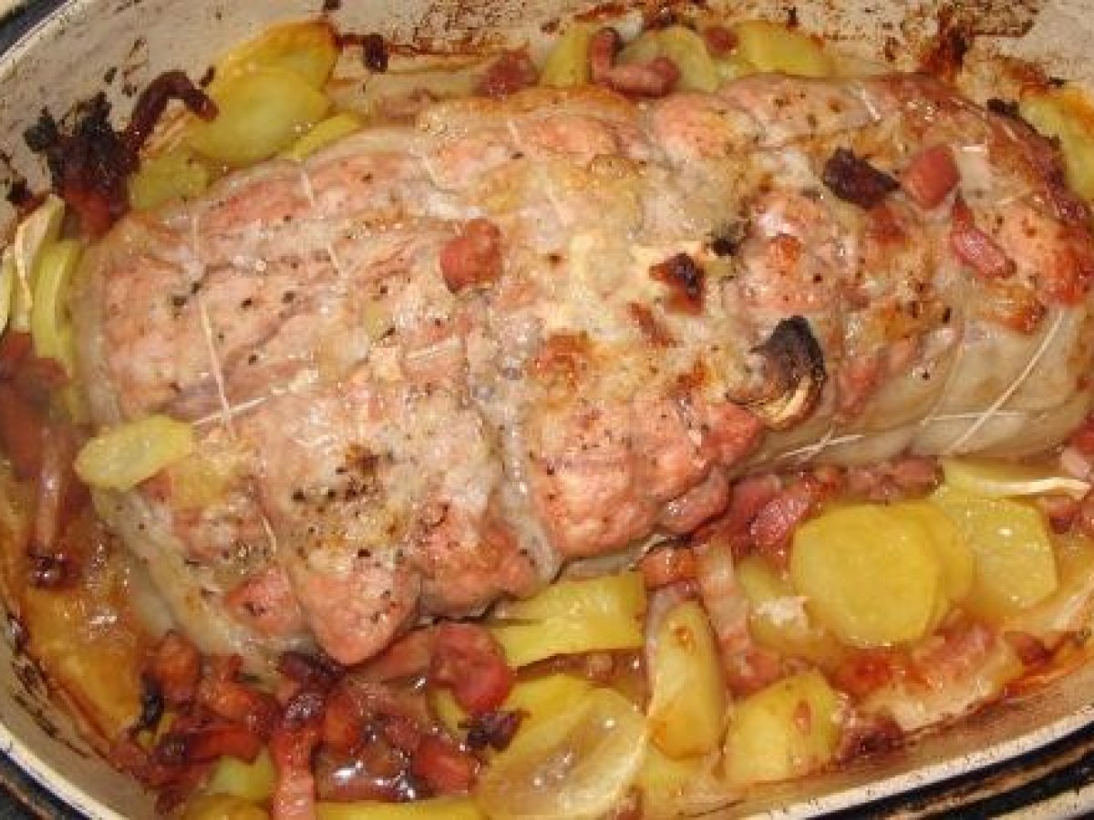 - Servez le rôti coupé en tranches épaisses, arrosées du jus de cuisson et entourées des pommes de terre, oignons et lardons.