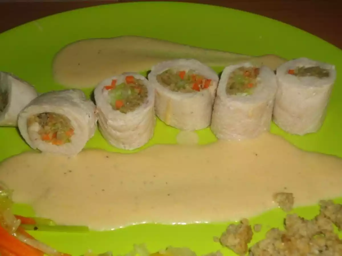 Roulade de poulet carottes , poireaux, champignons, sauce aux agrumes Platfacile30 min389 Kcal Envoyer cette recette à un ami Imprimer cette page Poser une question à l'auteur Publier votre photo de cette recette Ingrédients 4 4 escalopes de poulet extra fines 1 carotte 1 poireau 300 g de champignons de Paris 1 oeuf 1 pamplemousse rouge 1 orange 20 cl de crème sucre Coût estimé: 4.69Euros€ (1.17€/part)