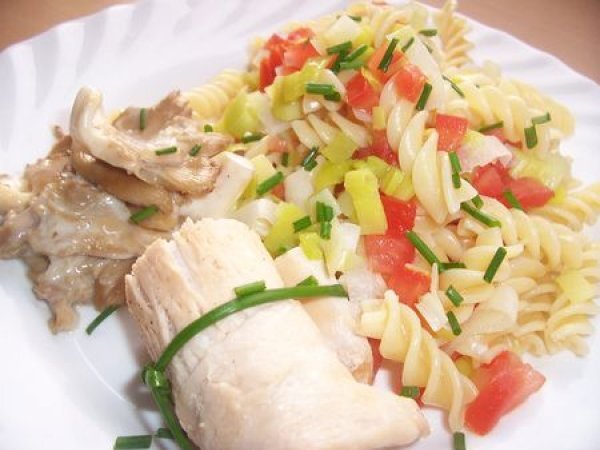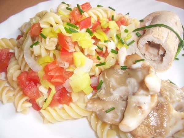 Roulé de dinde aux pleurotes et ses pâtes aux légumes PrécédentSuivant Platfacile30 min Envoyer cette recette à un ami Imprimer cette page Poser une question à l'auteur Publier votre photo de cette recette Ingrédients 2 2 escalopes de dinde 100g de pâtes 7-8 pleurotes 1 poireau 1 tomate ciboulette sel et poivre 2 cuillères à soupede crème fraîche épaisse