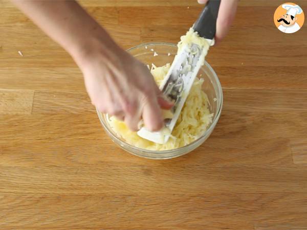 Battez les œufs en omelette en salant et poivrant, et mélangez les avec les pommes de terre râpées. Ajoutez l'oignon émincé.